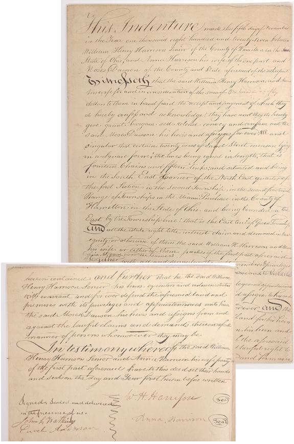 Harrison, William Henry and Anna. Document signed "Wm H. Harrison" and "Anna Harrison," 2pp (1 sheet) plus integral leaf with docket, 12½ x 8", Hamilton County, Ohio, November 5, 1827. A land indenture between William Henry Harrison and his wife Anna and Moses Dawson. For the sum of one hundred and fifty dollars, the Harrisons sell twenty acres of land "in the Miami Purchase in the County of Hamilton in the State of Ohio…." Very good; light toning and soiling; the document has been professionally silked. The combination of William Henry and Anna Harrison's signatures is scarce. Harrison (1773-1841) was serving in the U.S. Senate (1824-28) when he signed this document. He had won fame as an Indian fighter and hero of the War of 1812. His exploits would help propel him into the presidency in 1841, where he would serve a mere 31 days before succumbing to pneumonia. Anna Tuthill Symmes Harrison (1775-1864) was the first presidential widow to receive a pension.