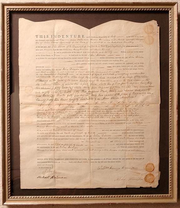 Harrison, William Henry and Anna. Partly-printed document signed ("Willm Henry Harrison" and "Anna Harrison"), July 17, 1810. The future President and First Lady, who is referred to as "daughter of John Cleves Symmes of the Town of Vincennes in the Indiana Territory," sell to John Dimon 62 and 80/100 acres located in Walpack, New Jersey, for the sum of $620. Two witnesses sign at lower left. The document has an attractive scallopped top. It. has been artfully matted and custom framed to an overall size of 19 x 17". Light toning and some transfer from seals, else fine.