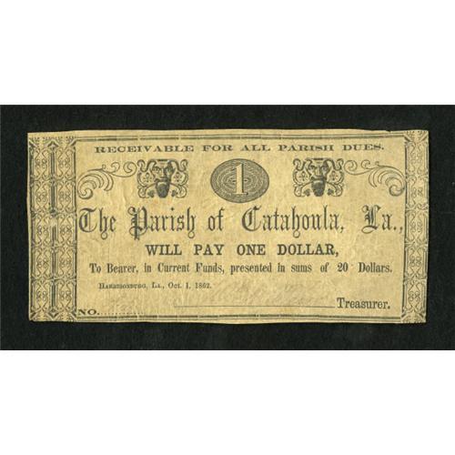 <B>Harrisonburg, LA- Parish of Catahoula </B></I>$1 Oct. 1, 1862 <BR> The signature and serial number have faded, though the note was fully issued. A POC has been closed with the help of some extra paper and a stamp hinge. <B>Very Fine.</B></I><BR><I>From The Collection of a Louisiana Gentleman</B></I><BR><BR><b>Shipping:</b> Coins & Currency (<a target="_blank" href="http://www.heritageauctions.com/common/shipping.php">view shipping information</a>)