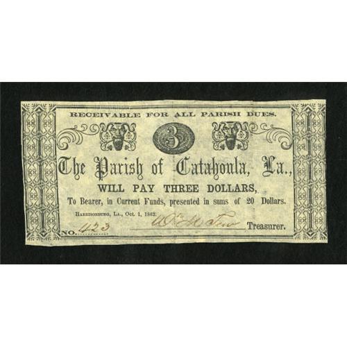<B>Harrisonburg, LA- Parish of Catahoula </B></I>$3 Oct. 1, 1862<BR> This is the variety that features the denomination between the demon head vignettes. Problem-free <B>Very Fine.</B></I><BR><I>From The Collection of a Louisiana Gentleman</B></I><BR><BR><b>Shipping:</b> Coins & Currency (<a target="_blank" href="http://www.heritageauctions.com/common/shipping.php">view shipping information</a>)