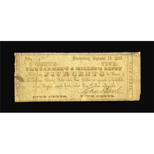 <B>Harrisonburg, VA- Farmer's and Miller's Depot </B></I>5¢ Sep. 13, 1861 Jones PH20-05<BR> This is the first time that this issuer has been in one of our auctions. This denomination is given a 7 rarity, 2 to 4 known, in the Jones-Littlefield reference. <B>Very Good.</B></I><BR><BR><b>Shipping:</b> Coins & Currency (<a target="_blank" href="http://www.heritageauctions.com/common/shipping.php">view shipping information</a>)