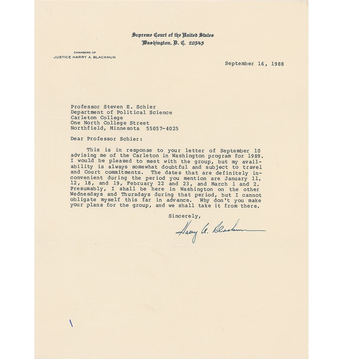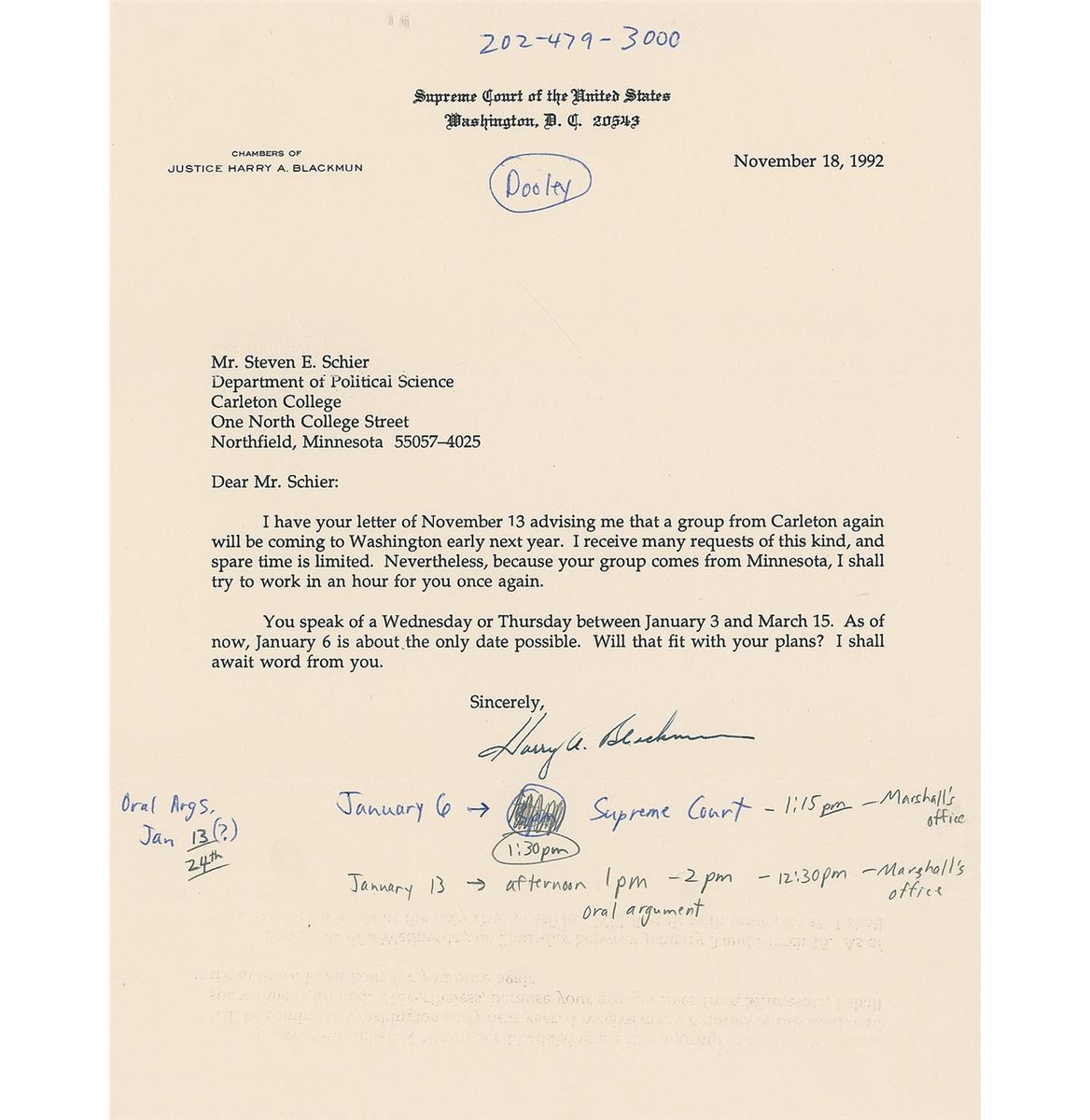 Two TLSs, each one page, 8.5 x 11, Supreme Court of the United States letterhead, 1988 and 1992. Letters to Steven E. Schier, professor of political science at Carleton College. Both concern arranging visits to meet with his students during trips to Washington, D.C. One, in part: “Because your group comes from Minnesota, I shall try to work in an hour for you once again.” One letter bears several notations in another hand regarding the arrangements. In overall fine condition. A Minnesota native, Blackmun grew up in Saint Paul and held academic and legal positions at the University of Minnesota, St. Paul College of Law, and Mayo Clinic before becoming a judge.