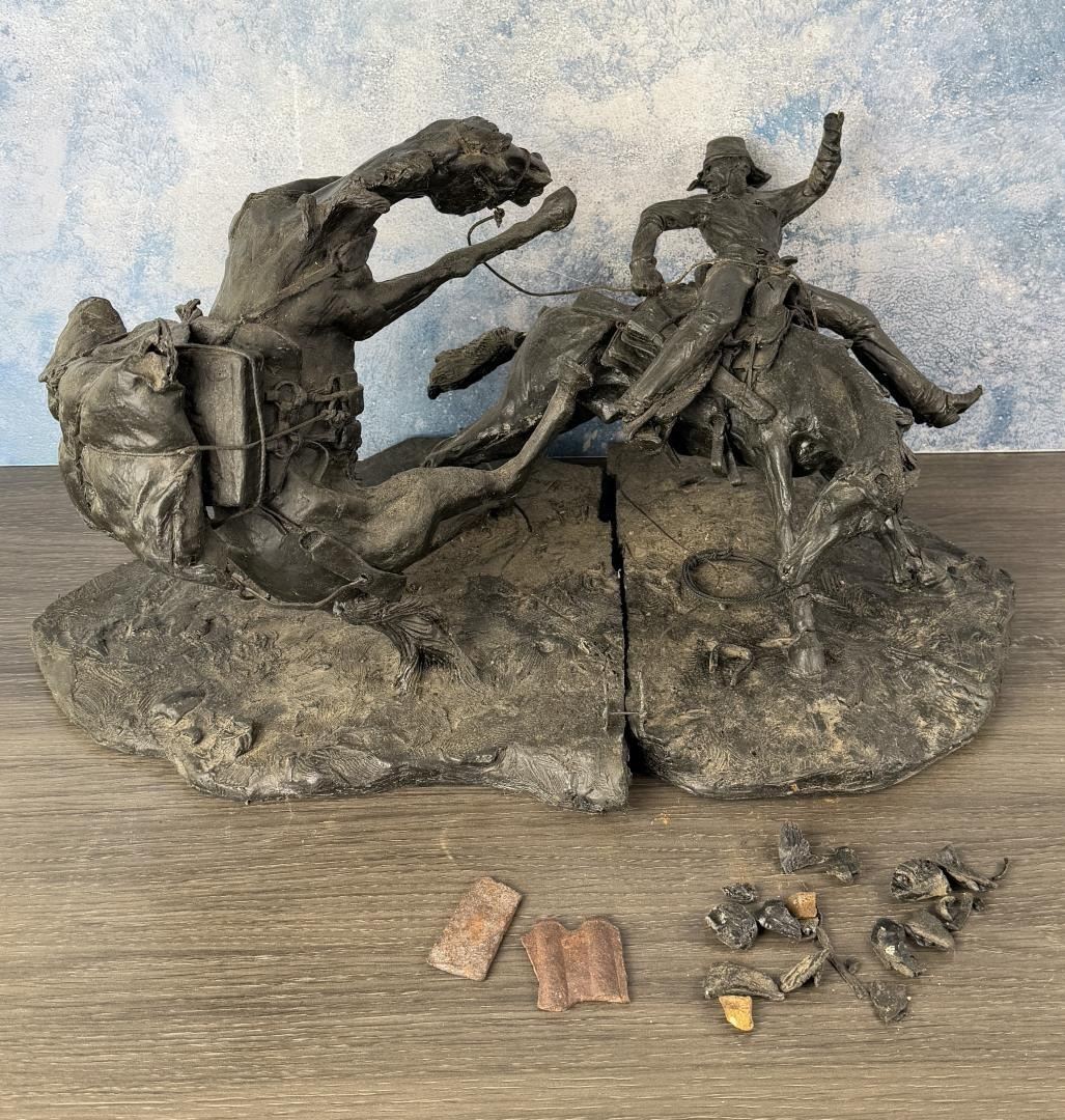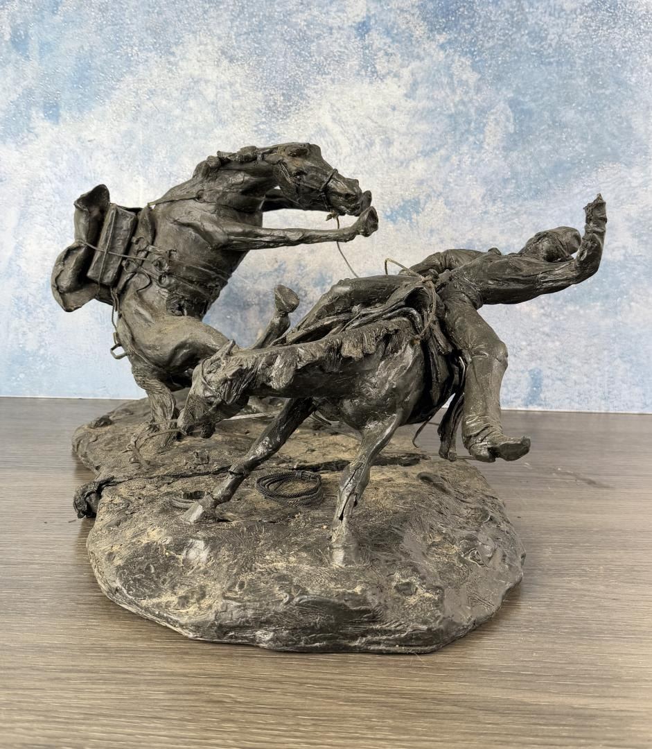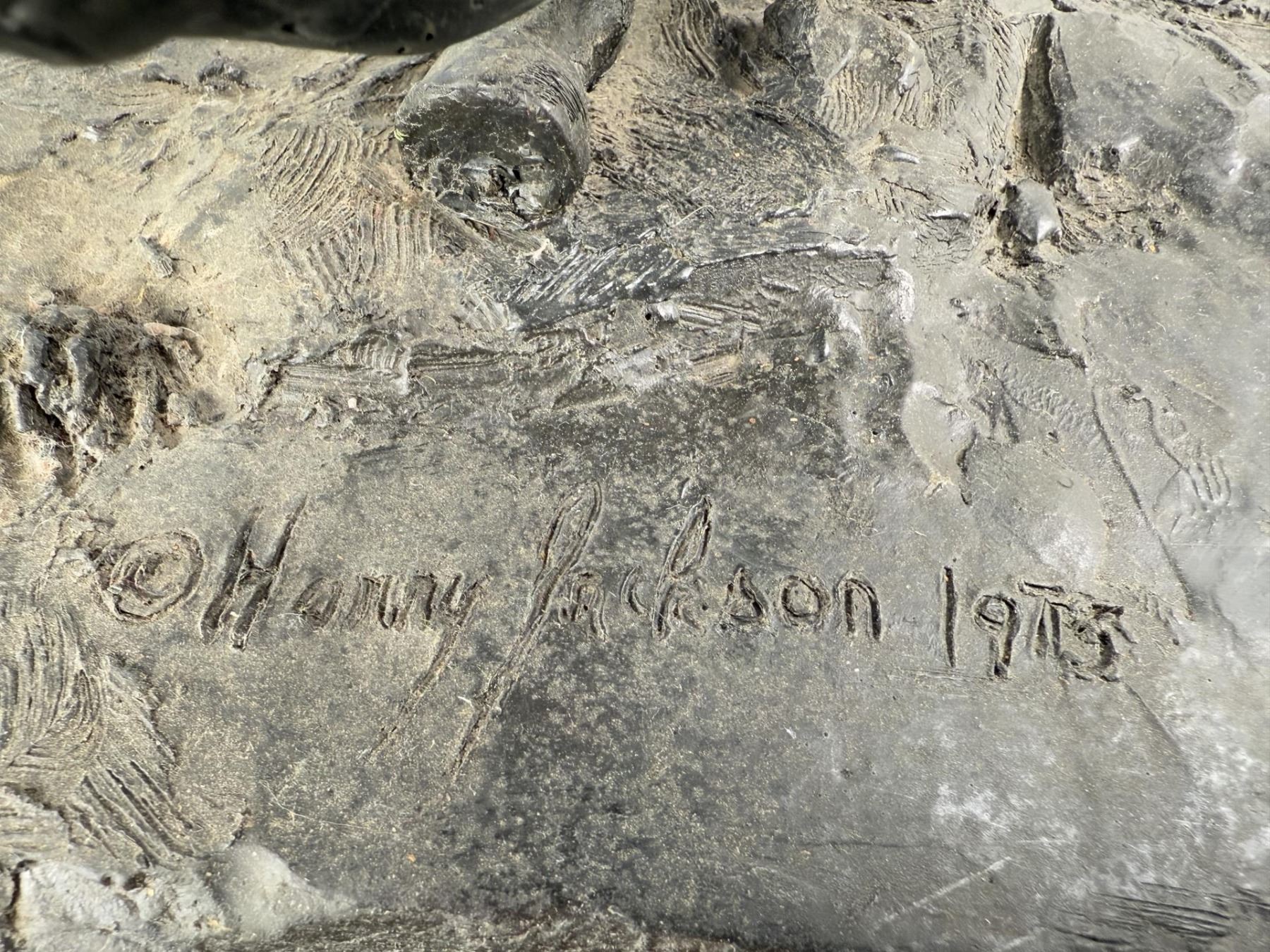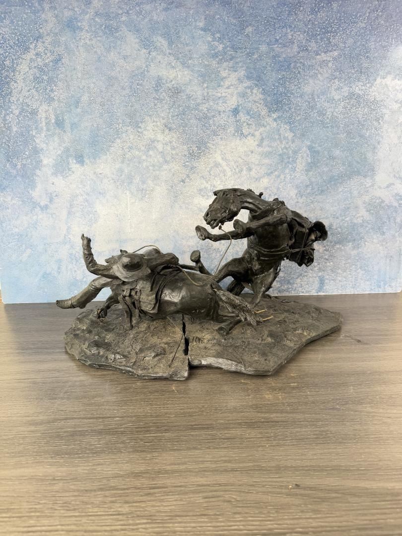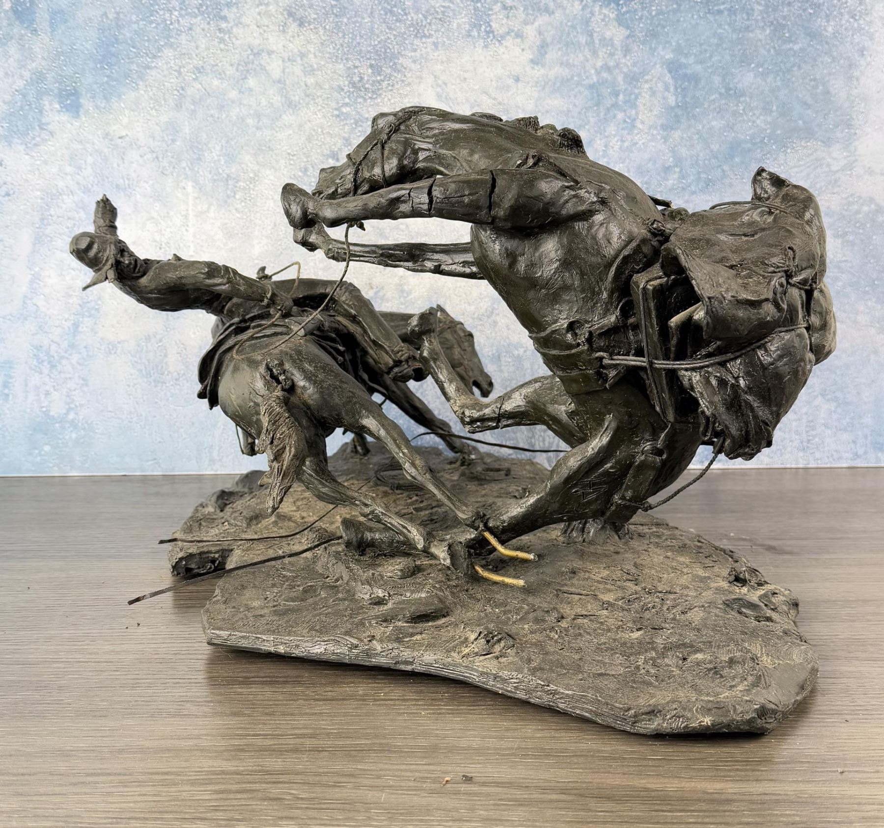 This is the original lost wax casting model for the bronze titled A Lack of Slack. Measures 22 3/4" by 14 7/8" by 11 1/2". Harry Andrew Jackson (1924 - 2011) was active/lived in Wyoming, Illinois. Harry Jackson is known for Sculpture-western figure, horses. Born with the name Harry Shapiro on the South Side of Chicago, Harry Jackson became a well-known 20th-century artists whose wide-ranging work includes painting and sculpture and styles ranging from Abstract Expressionism to Realism. He was raised in a family where his mother ran a cafe near the Stockyards, and his father was a drunken, violent man. Jackson was often a truant from school and loved to wander around the Harding Museum looking at Frederic Remington bronzes or to hang out at his mother's cafe listening to stories from the cowboys who had brought their cattle by trains to the stockyards. A teacher noticed his art talent and got him a scholarship to the Chicago Art Institute's Saturday children's classes. At age 14, he ran away from home to Wyoming where he worked at a lumber company and on a ranch. He regarded these experiences as his spiritual awakening, and his art talents were reinforced by praise from his cowboy peers. In the late 1930s, he returned to Chicago and studied at the Frederick Mizen Academy, The Chicago Academy of Fine Arts, and The Chicago Art Institute. In 1942, he entered the Marine Corps and became close to a man who introduced him to the classics of literature. In 1943, at Tarawa, he had shrapnel head wounds that caused him epileptic seizures for most of the remainder of his life, and he also took two bullets to the leg at Saipan. He was then, at age 20, ordered back to the U.S. where he was appointed an Official Marine Corps Combat Artist, the youngest in Marine history. Following discharge, he worked as a radio actor and went to New York with the idea of meeting his hero, Jackson Pollock, whom in 1948 he found to be "a beautiful fantastic man." The two formed a lasting friendship, and Pollock introduced Jackson to Abstract Expressionism, which helped Jackson express his troubled background. Jackson married artist Grace Hartigan, his first of six wives, at Pollock's home with Pollock serving as best man. He also took classes at the Brooklyn Museum and studied with Rufino Tamayo and Hans Hofmann. The newlyweds went to Mexico and further explored abstraction, and a year later the couple divorced. Jackson did scenery painting for theatre and television, headed to Europe, and returned to New York where he did portrait painting and began to break away from Abstract Expressionism, something that met with disapproval from his peers. He had a Fulbright Travel Scholarship, did some heroic paintings in Denmark, and added sculpting to his repertoire, a medium inspired on March 4, 1958 when he arrived in Peitrasanta, Italy, where a new foundry gave him space. He remained in Italy for several years. In 1966, his entire output of western art was given the first one-man show at the new National Cowboy Hall of Fame in Oklahoma City. By 1970, he was spending most of his time in Wyoming, becoming a resident of Cody, and was elected to the Cowboy Artists of America, but got "thrown out" because of his refusal to choose allegiances between it and the Cowboy Hall of Fame--entities that had had a major falling out.