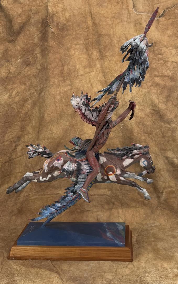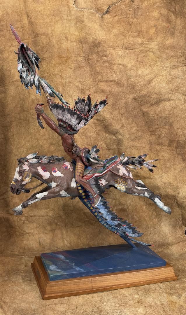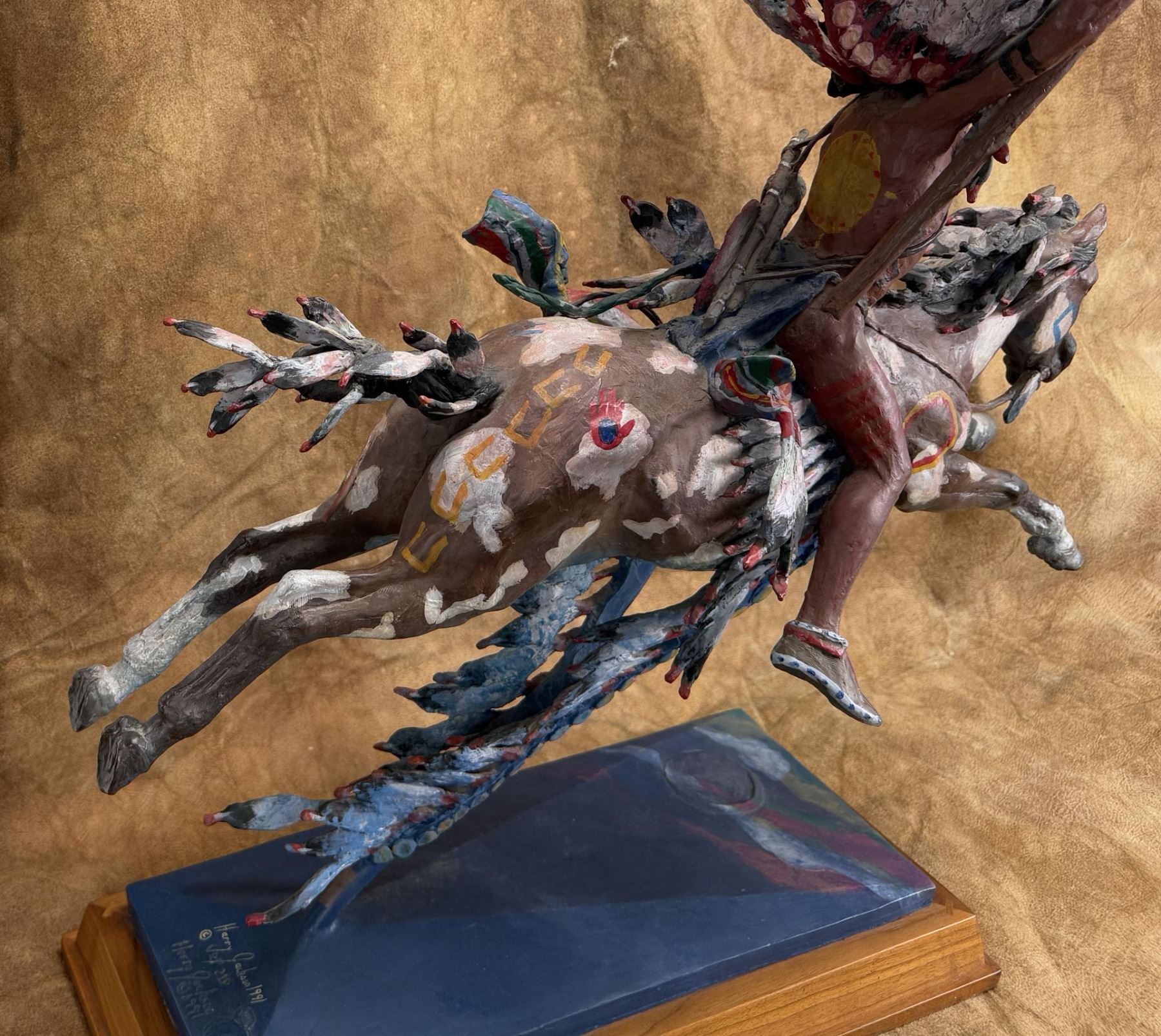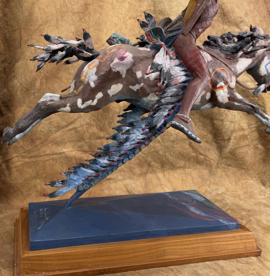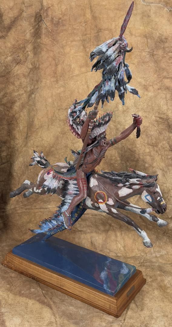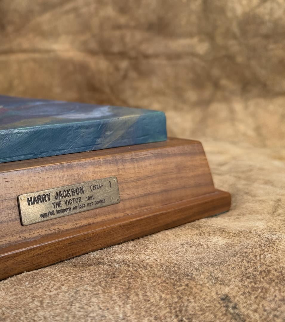 Title is The Victor. 26 1/4" by 15 1/2" by 39 1/2". Minor paint loss on the underside of the stem as shown. Harry Andrew Jackson (1924 - 2011) was active/lived in Wyoming, Illinois. Harry Jackson is known for Sculpture-western figure, horses. Born with the name Harry Shapiro on the South Side of Chicago, Harry Jackson became a well-known 20th-century artists whose wide-ranging work includes painting and sculpture and styles ranging from Abstract Expressionism to Realism. He was raised in a family where his mother ran a cafe near the Stockyards, and his father was a drunken, violent man. Jackson was often a truant from school and loved to wander around the Harding Museum looking at Frederic Remington bronzes or to hang out at his mother's cafe listening to stories from the cowboys who had brought their cattle by trains to the stockyards. A teacher noticed his art talent and got him a scholarship to the Chicago Art Institute's Saturday children's classes. At age 14, he ran away from home to Wyoming where he worked at a lumber company and on a ranch. He regarded these experiences as his spiritual awakening, and his art talents were reinforced by praise from his cowboy peers. In the late 1930s, he returned to Chicago and studied at the Frederick Mizen Academy, The Chicago Academy of Fine Arts, and The Chicago Art Institute. In 1942, he entered the Marine Corps and became close to a man who introduced him to the classics of literature. In 1943, at Tarawa, he had shrapnel head wounds that caused him epileptic seizures for most of the remainder of his life, and he also took two bullets to the leg at Saipan. He was then, at age 20, ordered back to the U.S. where he was appointed an Official Marine Corps Combat Artist, the youngest in Marine history. Following discharge, he worked as a radio actor and went to New York with the idea of meeting his hero, Jackson Pollock, whom in 1948 he found to be "a beautiful fantastic man." The two formed a lasting friendship, and Pollock introduced Jackson to Abstract Expressionism, which helped Jackson express his troubled background. Jackson married artist Grace Hartigan, his first of six wives, at Pollock's home with Pollock serving as best man. He also took classes at the Brooklyn Museum and studied with Rufino Tamayo and Hans Hofmann. The newlyweds went to Mexico and further explored abstraction, and a year later the couple divorced. Jackson did scenery painting for theatre and television, headed to Europe, and returned to New York where he did portrait painting and began to break away from Abstract Expressionism, something that met with disapproval from his peers. He had a Fulbright Travel Scholarship, did some heroic paintings in Denmark, and added sculpting to his repertoire, a medium inspired on March 4, 1958 when he arrived in Peitrasanta, Italy, where a new foundry gave him space. He remained in Italy for several years. In 1966, his entire output of western art was given the first one-man show at the new National Cowboy Hall of Fame in Oklahoma City. By 1970, he was spending most of his time in Wyoming, becoming a resident of Cody, and was elected to the Cowboy Artists of America, but got "thrown out" because of his refusal to choose allegiances between it and the Cowboy Hall of Fame--entities that had had a major falling out.