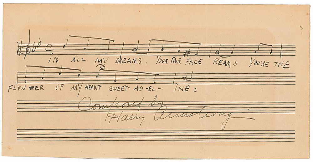 American singer, pianist, Tin Pan Alley composer, and booking agent (1879–1951). AMQS on an off-white 9.5 x 4.5 sheet of music manuscript paper. Armstrong pens five bars of music and lyrics to ‘Sweet Adeline,’ signed at the bottom, “Composed by Harry Armstrong.” In very good to fine condition, with two vertical folds passing through single letters of signature and a uniform shade of toning.