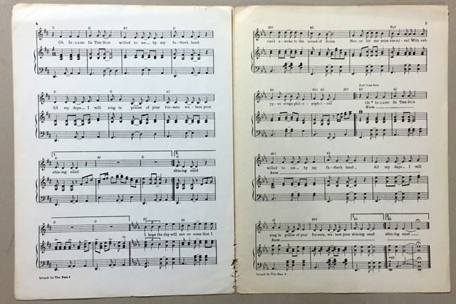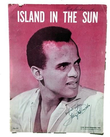 Sheet music, with digital signature of Harry Belafonte on the cover, of his song "Island in the Sun".
