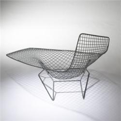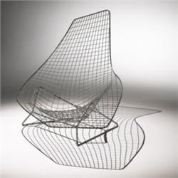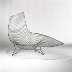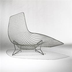 Harry Bertoia important prototype lounge chair USA, c. 1952 welded steel wire 58"w x 44"d x 35.75"h The lounge chair presented on the following pages is a prototype made by Harry Bertoia as part of his wire furniture developed for Knoll in the early 1950s. This chair is a unique example and was exhibited at Knoll Associates at 720 Park Avenue in New York City in 1953 during the launch of the Bertoia furniture line. This rare and extraordinary lounge chair is a masterpiece of experimental American chair design. In the 1940s, Bertoia was residing with his family in Venice, California and working at the office of Charles Eames on chair designs. Bertoia was utilized by the Eames office to engineer and troubleshoot the metal frames of the DCM and LCM, and is credited by some for developing the Eames wire chair forms. Harry Bertoia's design method for the wire furniture is summed up by the following, "how long are you going to sit in a chair? If it is only for an hour, you can have a small surface, possibly an erect posture . . . if you stay two hours, a larger surface because you must allow for movement." This method explains the shape of the wire chairs as they progress from the dining chairs into the small and large Diamond chairs, and to the Bird lounge chair. It is natural to see how the lounge chair offered here would be the final step in this progress. Harry's design process has been described by Val Bertoia as "intuitive engineering." The complex surface form of this chair is extraordinary for its refinement and complexity, decades before CAD programs simplified the process. Although loosely guided by principles in ergonomics he developed for the military during World War II, the prototype lounge was created simply from an inherent ability to visualize and produce functional and sculptural forms. The wire material perfectly suited Bertoia's skill as a metal smith and he found it intriguing that air and light surrounding the ethereal material actually completes the form. This concept was revolutionary at the time, and the materials used were a radical departure from heavy-handed furniture design at the beginning of the century. Ultimately, Knoll abandoned the idea of producing this chair design because of its complexity. The cost of producing such a design would have placed the chair beyond the reach of most consumers, which ran counter to the prevailing notion of design for the masses that was common in the 1950s. This Bertoia lounge chair prototype has remained in the possession of the Bertoia family since its creation. Brigitta used the chair in the yard of their Barto, Pennsylvania home. Harry and Brigitta Bertoia gave the chair to their daughter, Lesta, at the time of her wedding. Literature: World of Bertoia, Schiffer, ppg. 32-48, pg. 44 illustrated. Provenance: Harry Bertoia, Barto, Pennsylvania Lesta Bertoia, Pennsylvania Private Collection