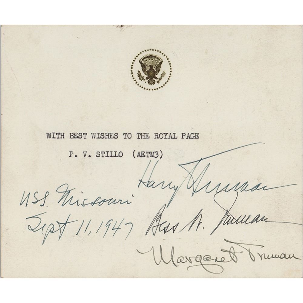 Ink signatures as first family, "Harry S. Truman, USS Missouri, Sept 11, 1947," "Bess W. Truman," and "Margaret Truman,” on an off-white 5.5 x 4.75 card with an embossed presidential seal and a typed inscription: "With best wishes to the Royal page, P. V. Stillo (AETM3)." In fine condition.