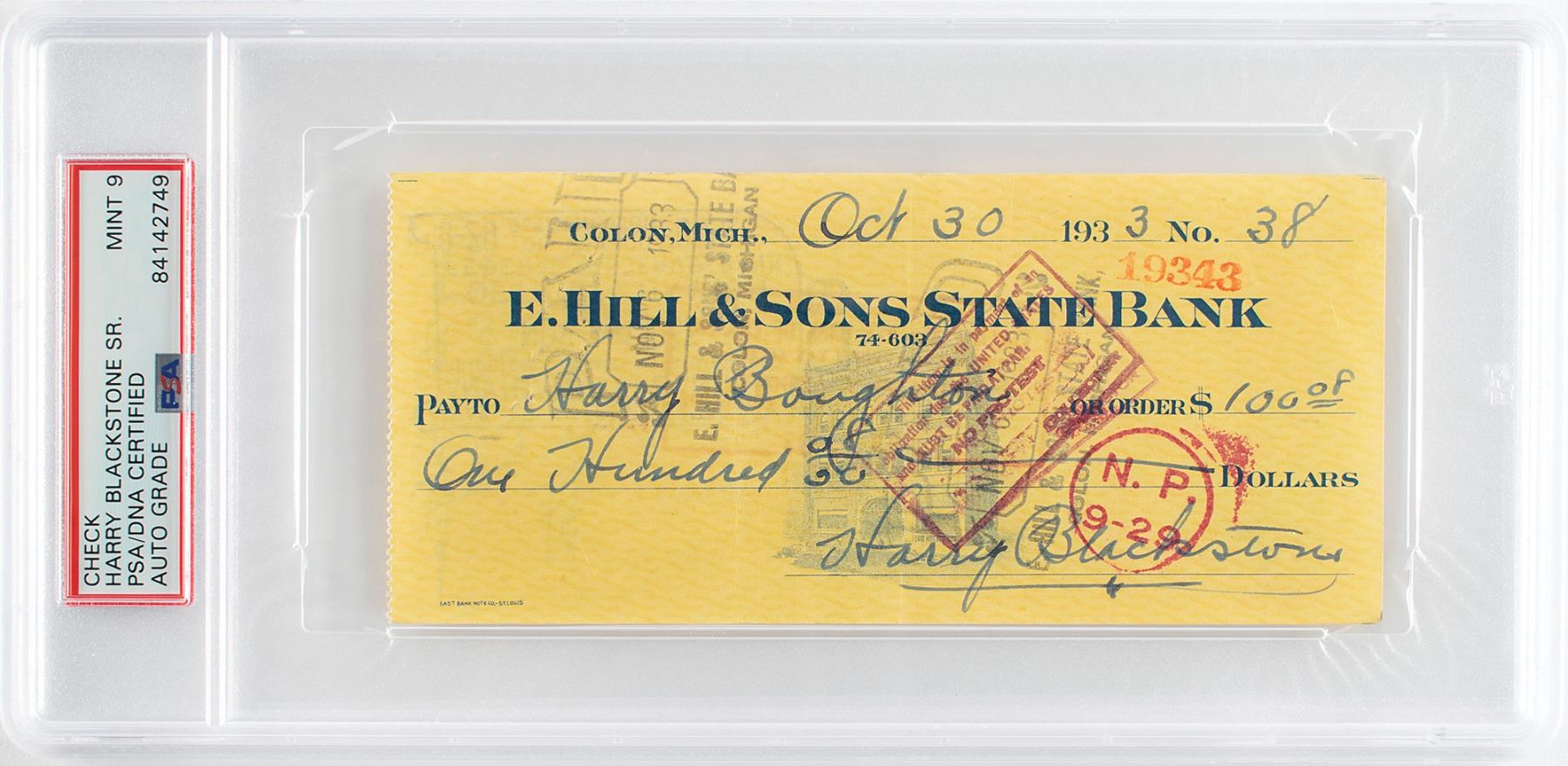 Bank check, 6 x 2.75, filled out and signed by Blackstone, Sr., "Harry Blackstone," payable to Harry Boughton for $100, October 30, 1933. In fine condition. Encapsulated in a PSA/DNA authentication and grading holder, evaluating the autograph as "MINT 9."