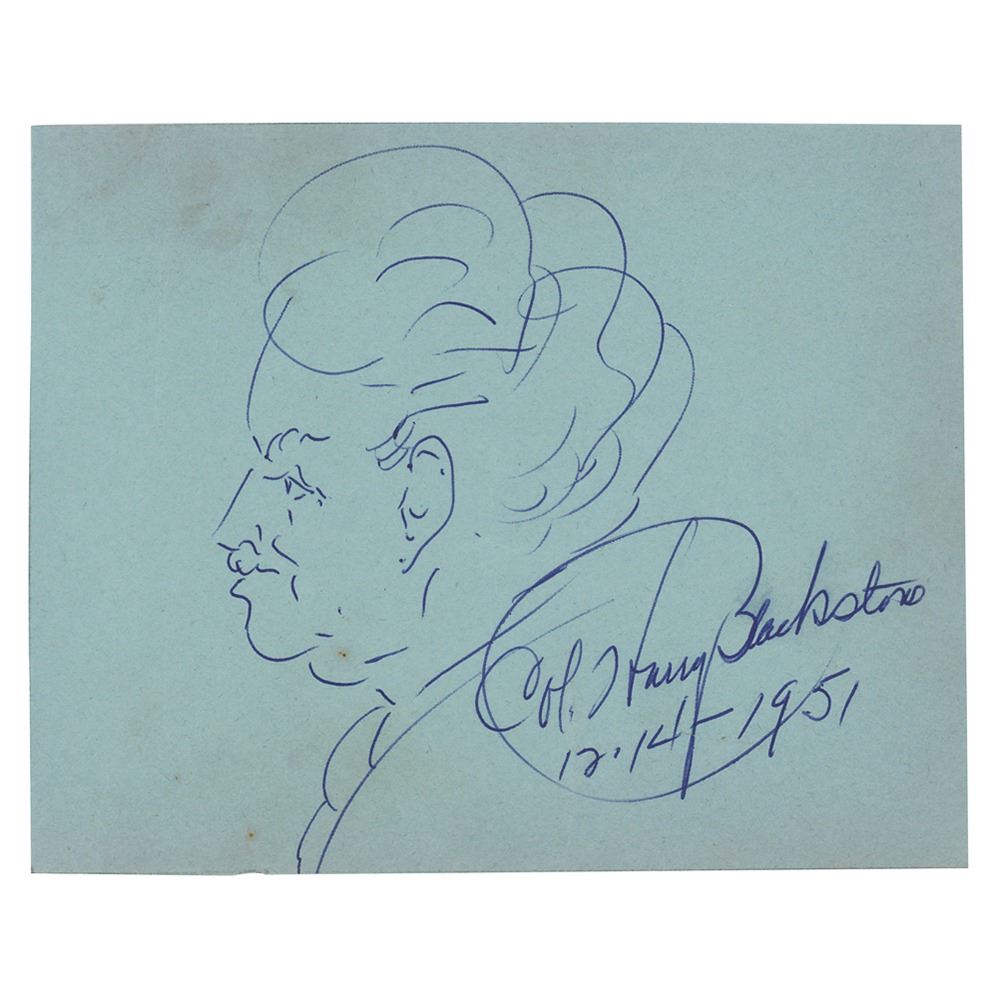 Vintage self-portrait sketch of Harry Blackstone in profile, accomplished in ballpoint on a blue 6 x 4.75 album page, which is signed, "Col. Harry Blackstone, 12. 14—1951." In very good to fine condition, with some light creasing and faint staining. Accompanied by a full letter of authenticity from JSA.