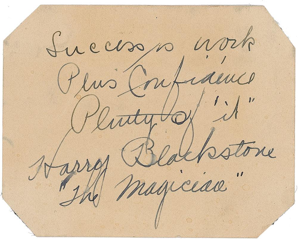 AQS, signed “Harry Blackstone ‘The Magician,’” on an off-white 3.25 x 2.5 card. Blackstone writes: “Success is work, Plus confidence, Plenty of ‘it’.” Clipped corner tips, scattered light soiling, and a couple small brushes to signature and quote, otherwise fine condition.
