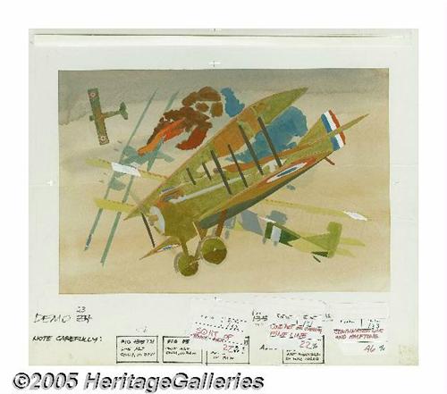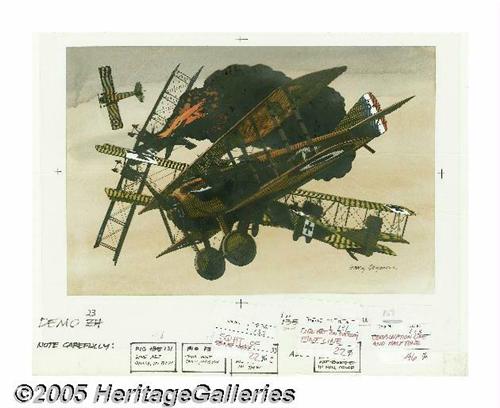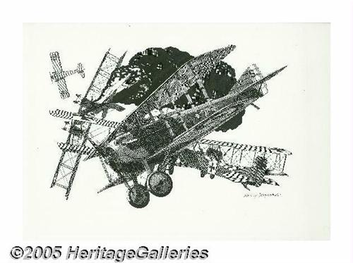 <B>Harry Borgman - "Drawing in Ink" Cover Illustration Original Art (Watson-Guptill, 1977).</B></I> Harry Borgman worked as an art director for Chevrolet, and also served as the Chairman of the Advertising Department of the Art School of the Society of Arts and Crafts (later renamed Center for Creative Studies). In 1977, with years of experience in the field, he wrote "Drawing in Ink," for Watson-Guptill publications. This finely detailed World War I dogfight scene appeared as the cover and also as "Demonstration 2. Crosshatching with a Pen" (on pages 54-61) of the book. Also included in this lot is a watercolored "blue line" illustration of the scene with the line art printed on an acetate overlay. The image area of the art is approximately 16" x 12" and it is in Excellent condition.