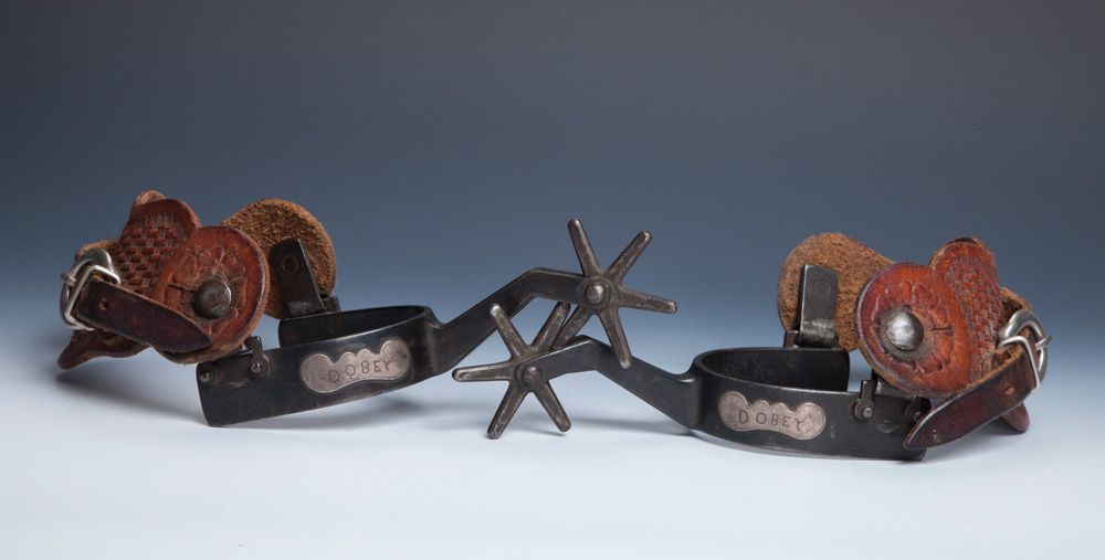 Harry Carey, Jr.'s Personal Kelly Bros. Spurs. Special order Kelly Bros maker-marked Texas spurs with swinging buttons, 2 1/2" six point rowels and "DOBEY" engraved on the mustache mounting. Spurs are in very fine condition with later-made basket-stamped two-piece leathers. PROVENANCE: Carey Family Trust. Harry Carey Jr. was nicknamed "Dobe" because of his red hair, the color of adobe. He also appeared as a character named "Dobey" in the 1946 movie, "Rolling Home" starring Jean Parker and Russell Hayden. This was the first film Harry Carey, Jr. appeared in as an adult, and came about when the just-discharged-from-the-Navy Carey Jr. ran into producer William Berke on an Hollywood street corner. Berke, who had produced six sound westerns in the mid-30s starring the elder Carey, offered Carey junior a bit in the film. The first film Harry Carey, Jr. ever appeared in was in 1921, as an infant in one of his father's silent westerns.