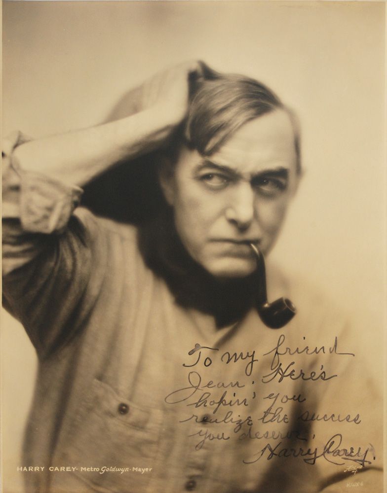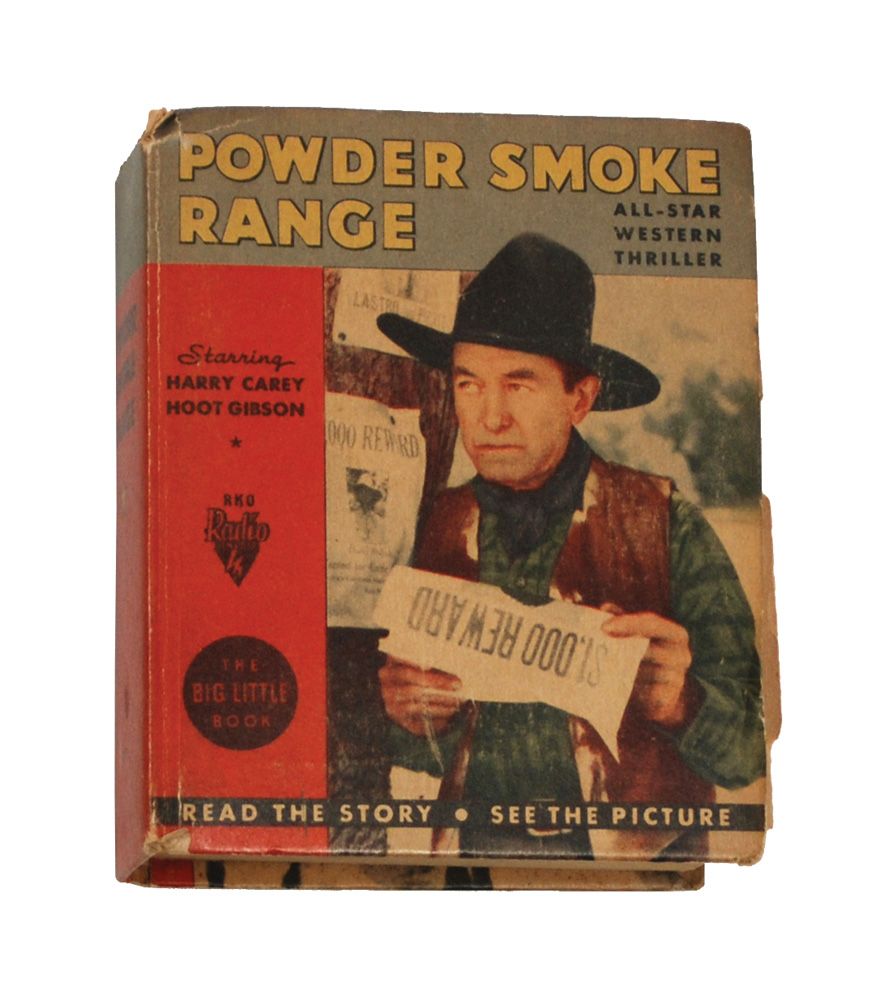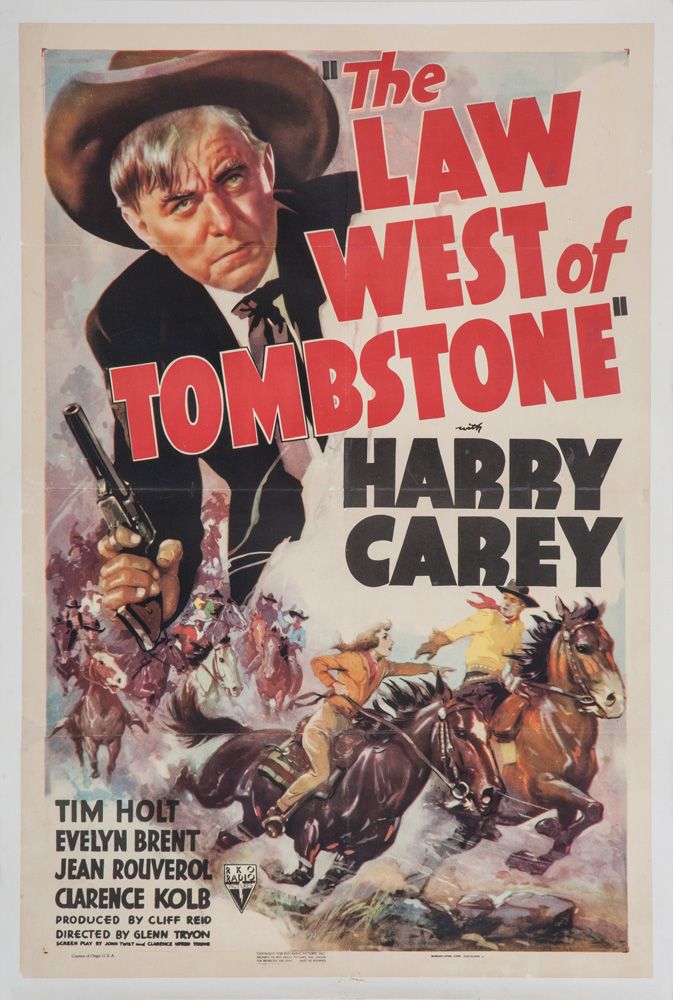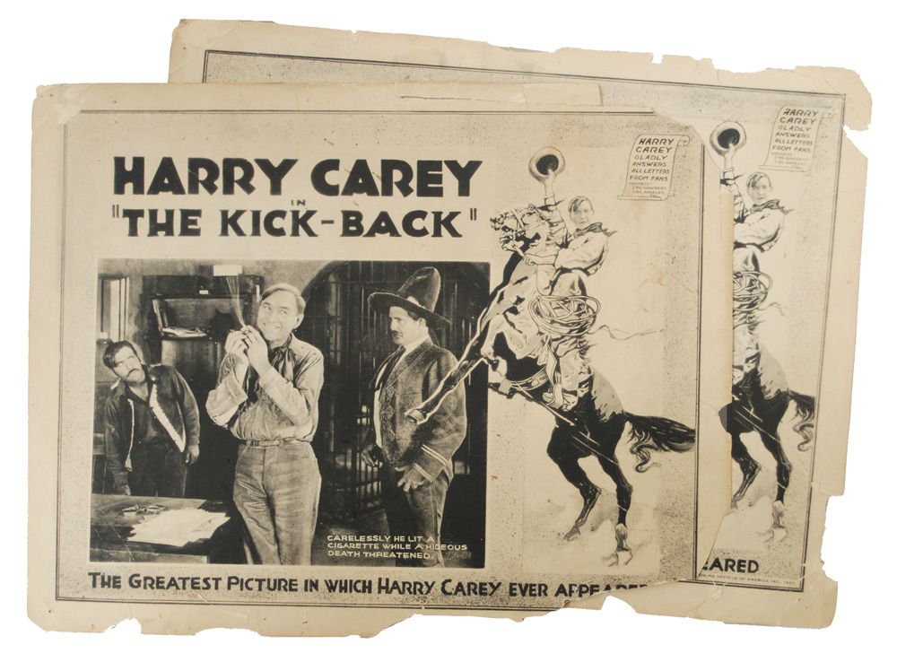 Harry Carey Movie Array - Posters and Lobby Cards. ?a) "The Law West of Tombstone" single sheet poster, starring Harry Carey. 40" x 26" mounted on linen with colorful graphics showing Harry in action. RKO Radio Pictures, 1938; b) photo of John Wayne, Montie Montana, Harry Carey, 11" x 14"; c) Autographed photo of Harry Carey, 11" x 14"; d) Sketch of Harry Carey given to "Dobe" (Harry Carey Jr.) from artist John Agner, 1998; e) "Powder Smoke Range" Big Little Book. Good condition, circa 1935; f) "Border Cafe" half sheet poster, RKO Radio Pictures, 22" x 14"; g) 30 Lobby Cards: 1) "Border Cafe," 2-3) "The Kick-Back," 2 copies. In delicate condition (1922). Harry Carey starred in and co-wrote; 4) "Without Honors" (may be a photograph); 5) "The Return of the Mohicans"; 6) "The Last of the Mohicans" Episode 3 (Rifle or Tomahawk) - Mascot Serials; 7) "Headin' for God's Country"; 8) "If Only" Jim - Universal Special Attraction; 9) "Happy Land"; 10-13) "Buffalo Stampede" (4 variations); 14) "Street of Missing Men"; "Port of Missing Girls"; 15) "Sundown;" 16) "Man of the Forest"; 17) "Code of the Streets"; 18-19) "Parachute Battalion" (2 variations); 20) "Among the Living"; 21) "So Dear to my Heart" - Walt Disney; 22) “The Man from Red Gulch" (Photo of lobby card); 23) "Man of the Forest"; 24) "My Son is Guilty"; 25-27) "Racing Lady" (2 variations); 28) "Sky Giant"; 29-30) "Rustler's Paradise" (2 variations). PROVENANCE: Carey Family Trust
