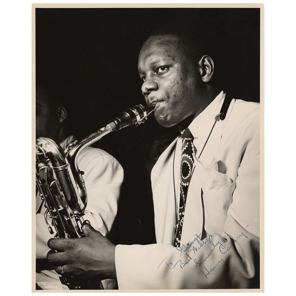Vintage matte-finish 8 x 10 Bill Gottlieb photo of Carney playing his sax, signed and inscribed in fountain pen, "To George, Best Wishes, Sincerely, Harry Carney." Reverse bears a photographer's stamp. In fine condition.