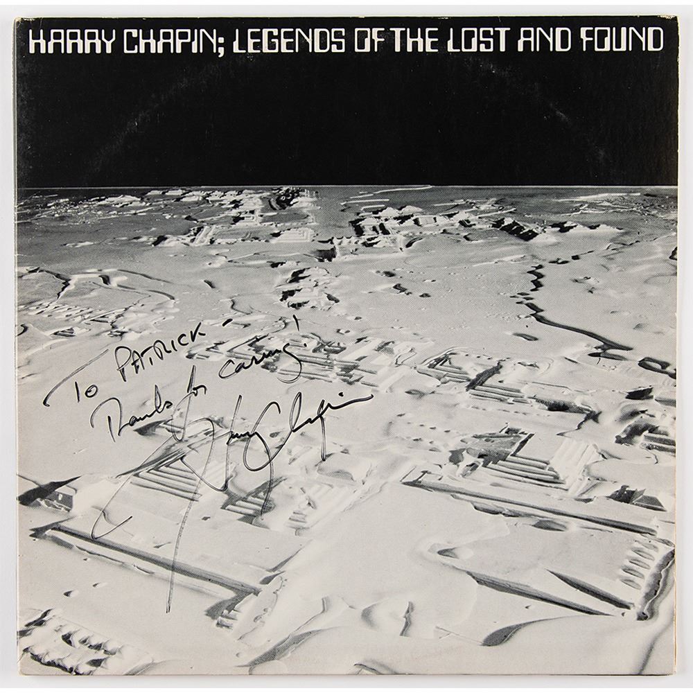 Legends of the Lost and Found album by Harry Chapin, signed and inscribed on the front cover in black felt tip, "To Patrick—Thanks for caring! Harry Chapin." In fine condition. The records are included.