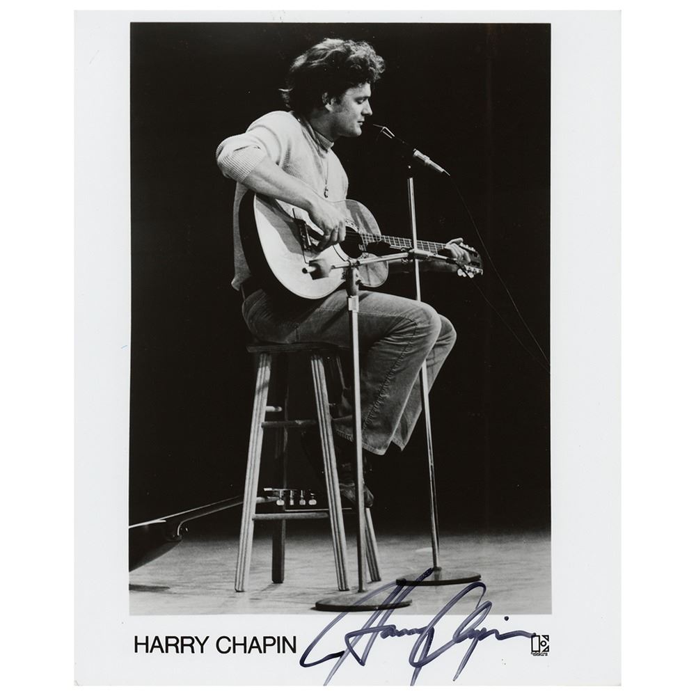 Glossy 8 x 10 Elektra Records publicity photo of Harry Chapin seated on a stool and playing the guitar during a live performance, signed in black felt tip. In very good to fine condition, with small surface impressions in Chapin's hair, and a light central vertical bend.