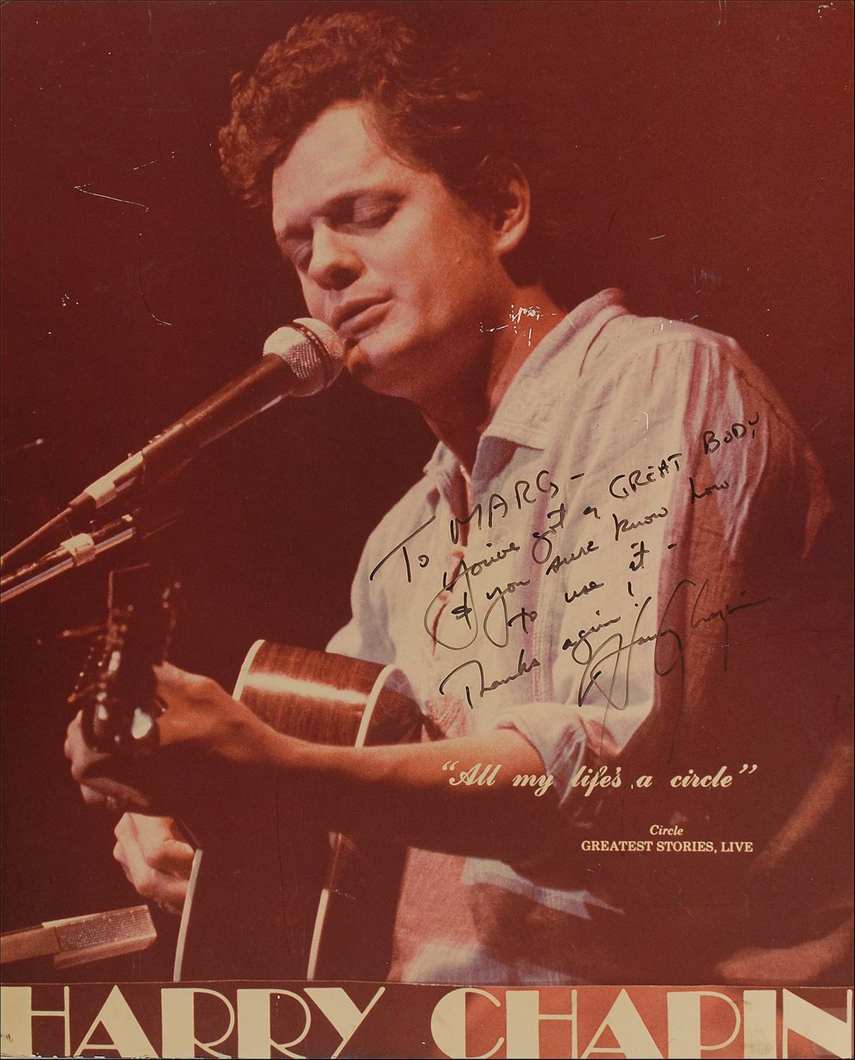Popular American singer and songwriter (1942–1981) of such hits as ‘Cats in the Cradle’ who died in an auto accident at the age of 38. Color 19 x 23.75 poster of Chapin performing, signed and inscribed in black felt tip, “To Marg—You’ve got a GREAT BODY & you sure know how to use it. Thanks again! Harry Chapin.” Poster is affixed to an identical size board and placed atop a same-size frame. In very good condition, with scattered surface marks, scratches, and light surface loss.