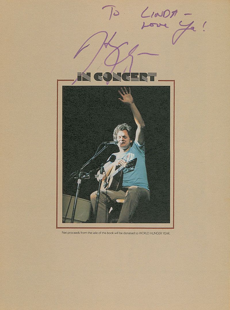 Program for Chapin’s 1977 On the Road tour, 9 x 12, signed and inscribed on the first page in purple felt tip, “To Linda—Love ya! Harry Chapin.” In fine condition, with some light creases to the spine. Accompanied by a certificate of authenticity from Roger Epperson/REAL.