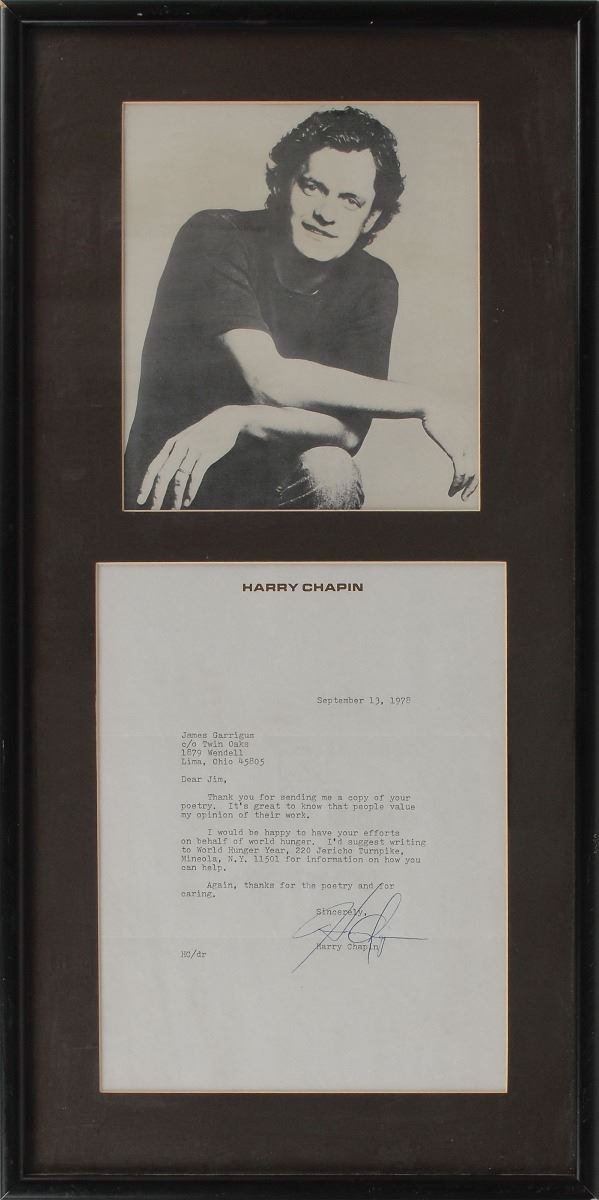 TLS, one page, 7.75 x 10, personal letterhead, September 13, 1978. Letter to James Garrigus, in full: “Thank you for sending me a copy of your poetry. It’s great to know that people value my opinion of their work. I would be happy to have your efforts on behalf of world hunger. I’d suggest writing to World Hunger Year, 220 Jericho Turnpike, Mineola, N.Y. 11501 for information on how you can help. Again, thanks for the poetry and for caring.” Matted and framed with an image of Chapin to an overall size of 11.5 x 22.75. In fine condition.