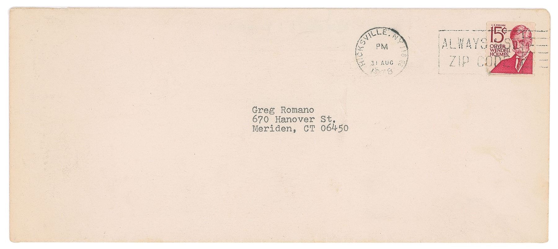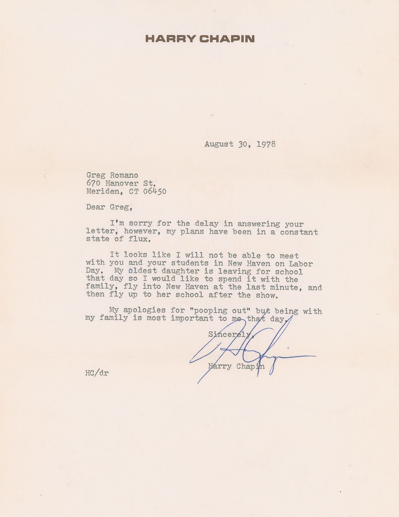TLS, one page, 8.5 x 11, personal letterhead, August 30, 1978. Letter to Greg Romano, in part: "It looks like I will not be able to meet with you and your students in New Haven on Labor Day. My oldest daughter is leaving for school that day so I would like to spend it with the family, fly into New Haven at the last minute, and then fly up to her school after the show. My apologies for 'pooping out' but being with my family is most important to me that day." In fine condition. Accompanied by the original mailing envelope.