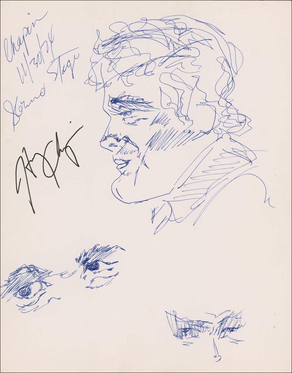 Original signed blue ballpoint sketch, on an off-white 11 x 14 sheet, of Chapin’s profile and eyes. Evidently drawn during a rehearsal by an unknown artist, who has annotated it in the upper left, “Chapin 11/30/74 Sound Stage.” Signed in black felt tip by Chapin. In fine condition.