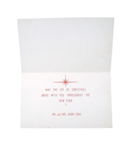 Harry Cohn, best known as “King Cohn”, was the legendary and many say monstrous and intimidating “bully” president of Columbia Studios. In fact, he fashioned his office (complete with a towering desk) on Mussolini’s, whom he resembled in both statue and temperament. Cohn turned what was known as that “chicken farm of a studio on Gower Gulch” into one of the most respected and successful studios in the Industry. He was, in fact, allegedly the inspiration for the “horse in the bed” Studio Head, Jack Woltz, in “The Godfather”. In fact when he died in 1958, Cohn was the subject of the famous quote from Red Skelton, who remarked of Cohn's well-attended funeral, "It proves what Harry always said, give the public what they want and they'll come out for it." In fact the majority of those who attended the funeral were there because they wanted proof that Harry Cohn was indeed dead! Many a star, director, writer and producer had literally fist to fist confrontations with him, including Van Johnson. However, business was business, and if you made money for Columbia, all was forgiven. This is an extremely rare actual Christmas Card from Harry Cohn sent to Van Johnson. It comes directly from the Van Johnson Estate Collection and includes a Letter of Provenience from his daughter, Schuyler Johnson along with a copy of her famous controversial cover story article “My Life As A Hollywood Princess”, about her trials and tribulations growing up in Beverly Hills with a superstar father and extended “family” with some of the most famous celebrities in the world.