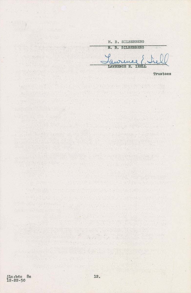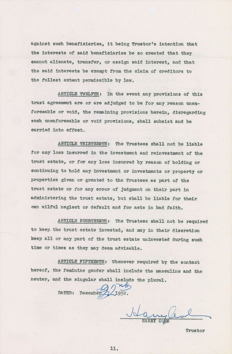 DS, twelve onionskin pages, 8.5 x 13, December 22, 1950. A trust estate agreement between Harry Cohn and M. B. Silberberg and Lawrence E. Irell, in which Cohn “does hereby grant, transfer and assign to the Trustees…the property set forth in Schedule ‘A.’” Signed at the conclusion of page eleven in blue fountain pen by Cohn as the trustor, and countersigned on the final page by Silberberg and Irell as the trustees. Included is an additional two-page rider featuring a notarized statement for all three signers, and the contents of “Schedule ‘A,’” which lists 6,200 shares of Columbia Pictures Corp. common stock. In fine condition, with a crease through end of signature.