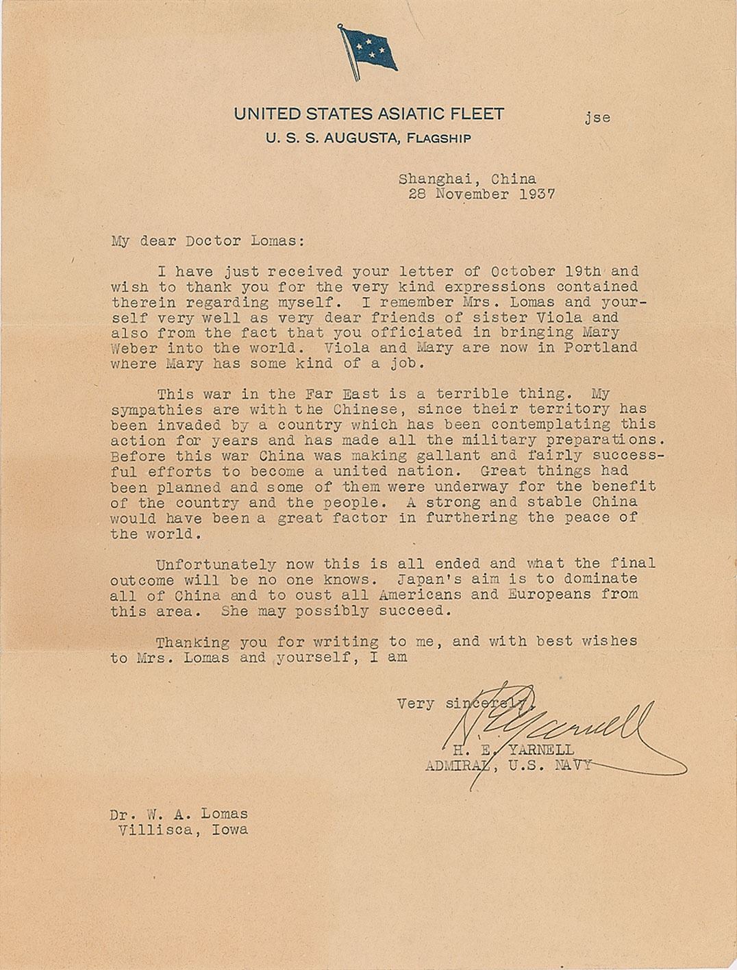 TLS signed “H. E. Yarnell,” one page, 8 x 10.5, United States Asiatic Fleet letterhead, November 28, 1937. Letter to Dr. W. A. Lomas, in part: "This war in the Far East is a terrible thing. My sympathies are with the Chinese, since their territory has been invaded by a country which has been contemplating this action for years and has made all the military preparations. Before this war China was making gallant and fairly successful efforts to become a united nation. Great things had been planned and some of them were underway for the benefit of the country and the people. A strong and stable China would have been a great factor in furthering the peace of the world. Unfortunately now this is all ended and what the final outcome will be no one knows. Japan's aim is to dominate all of China and to oust all Americans and Europeans from this area. She may possibly succeed." In very good to fine condition, with areas of light toning, and creasing along the right edge. Accompanied by the original mailing envelope.