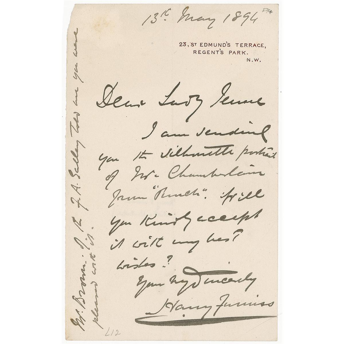 Irish-born artist (1854–1925) best known for his satirical illustrations for Punch magazine. ALS, one page, 4.5 x 7, personal letterhead, May 13, 1894. Letter forwarding one of his drawings. In part: “I am sending you the…portrait of Mr. Chamberlain from ‘Punch.’ Will you kindly accept it with my best wishes?” In fine condition, with central horizontal and vertical fold, one through a single letter of signature, missing top left corner tip, and a trivial spot of toning.