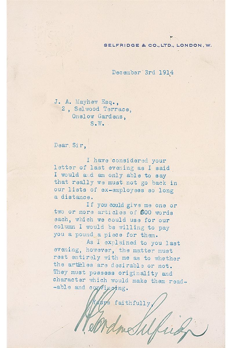 Retail magnate who founded the London-based department store Selfridges, becoming one of the most respected and wealthy businessmen in the United Kingdom (1858–1947). Mr Selfridge, a successful period television drama based on his life, began airing in the UK and US in 2013. TLS, signed “H. Gordon Selfridge,” one page, 5 x 8, Selfridge & Co. letterhead, December 3, 1914. Letter to a gentleman. In part: “If you could give me one or two more articles of 600 words each, which we could use for our column I would be willing to pay you a pound a piece for them…however, the matter must rest entirely with me as to whether the articles are desirable or not. They must possess originality and character which would make them readable and convincing.” In fine condition, with a mildly toned area at the center of the signature.