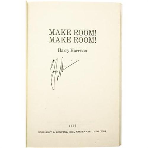 <B>Harry Harrison: Signed First Edition of <I>Make Room! Make Room!</B></I></B></I> (Garden City, New York: Doubleday and Company, Inc., 1966), first edition, 216 pages, jacket by Charles and Cuffari, black cloth with gilt titles, 8vo (5.75" x 8.5"), dust jacket. Signed by the author on the title page. Minimal rubbing to the edges of the book, else fine. A beautiful example of the book made famous by its adaptation to film as <I>Soylent Green</B></I>.<BR><BR><b>Shipping:</b> Books & Catalogs (<a target="_blank" href="http://www.heritageauctions.com/common/shipping.php">view shipping information</a>)