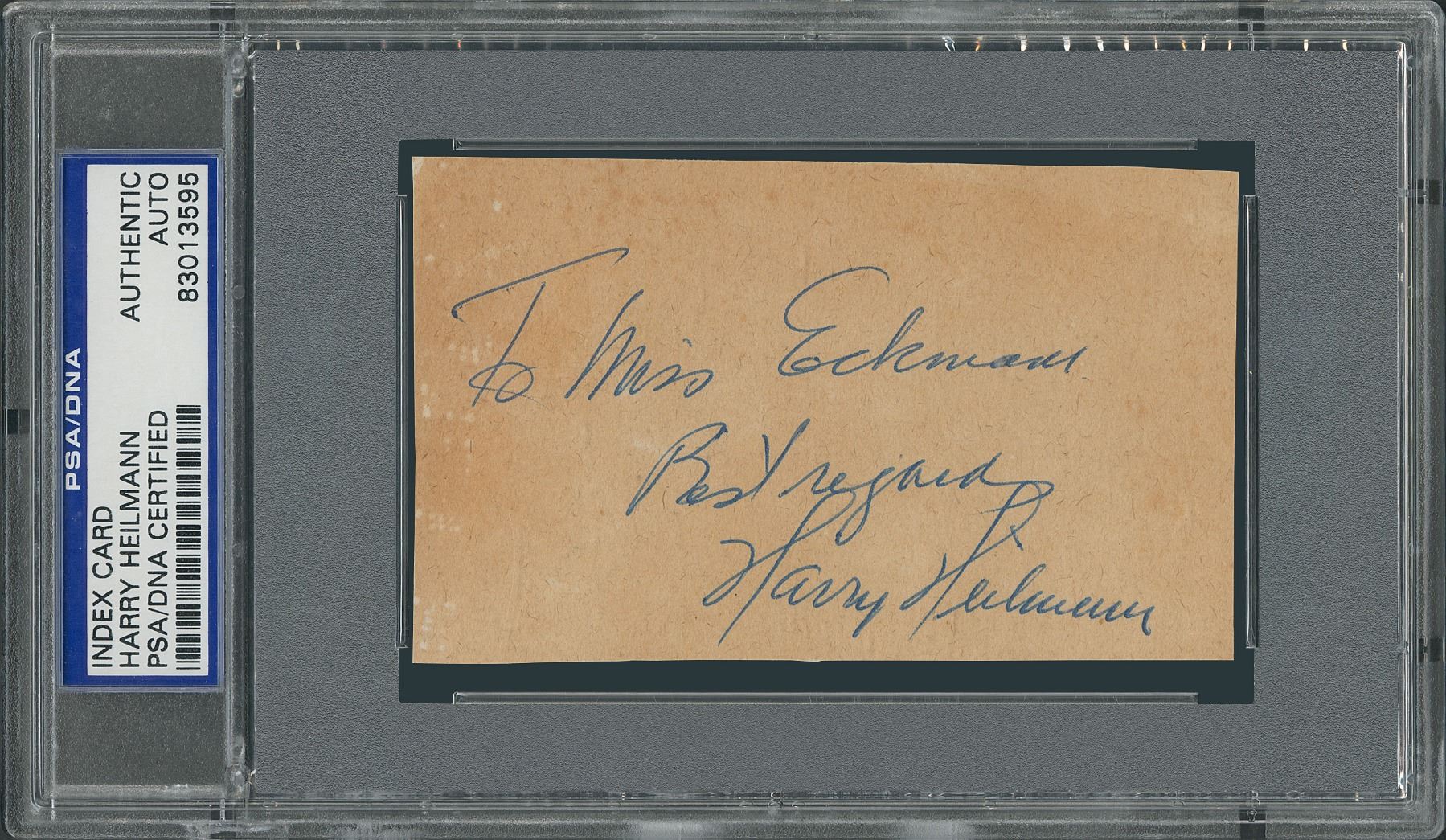 Vintage ballpoint signature and inscription, "To Miss Eckmam, Best regards, Harry Heilmann,” on an off-white 4 x 2.5 card. In very good to fine condition, with overall toning. Encapsulated in a PSA/DNA authentication holder.