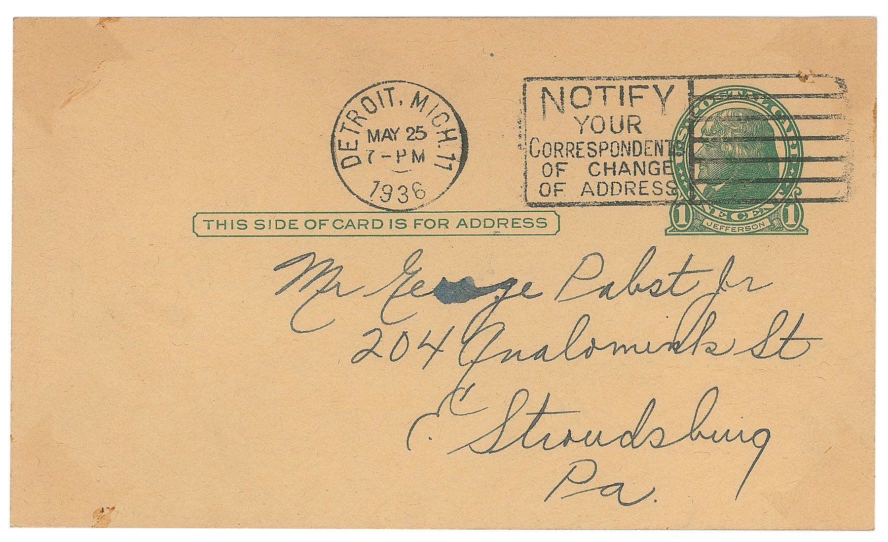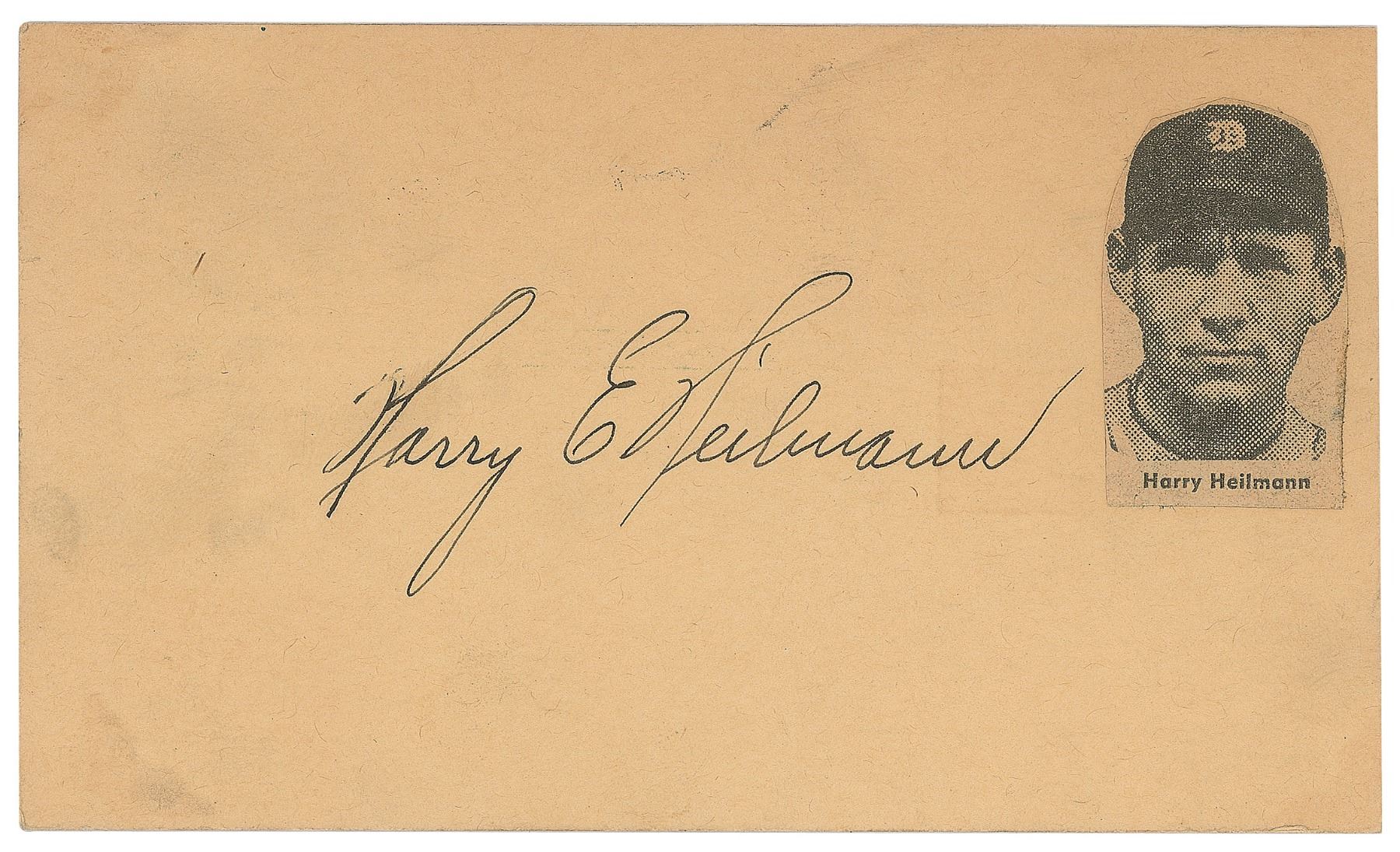 Vintage ink signature, "Harry E. Heilmann,” on an off-white 5.5 x 3.25 government postcard bearing a small affixed image of the Detroit Tigers legend. Reverse addressed in Heilmann's own hand, postmarked May 25, 1936. In fine condition, with light soiling.