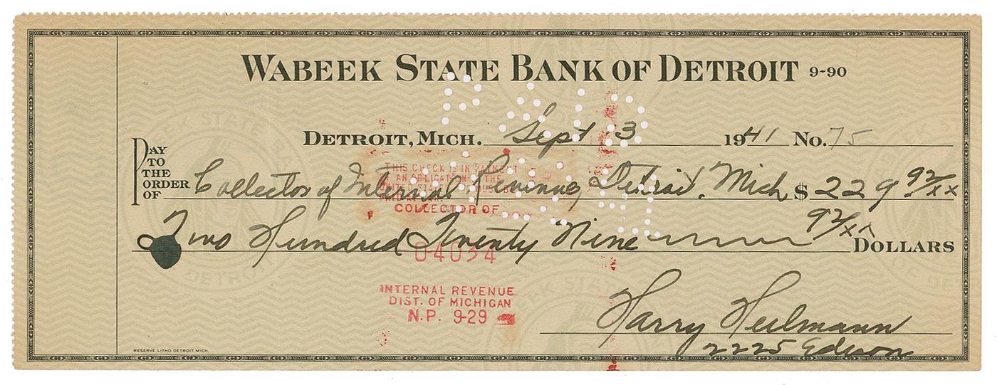 Hall of Fame baseball player (1894–1951) who played on the Detroit Tigers under Ty Cobb, his manager and mentor. Heilmann won four batting titles between 1921 and 1927 and came within nine hits of hitting .400 each year. After his 17-year playing career ended, he broadcast Tigers games for another 17 years. Bank check, 8.25 x 3, filled out and signed by Heilmann, payable to Collector of Internal Revenue, Detroit Mich. for $229.92, September 3, 1941. Vertical fold to left side, expected stamps and holes, and some scattered light toning, otherwise fine condition.