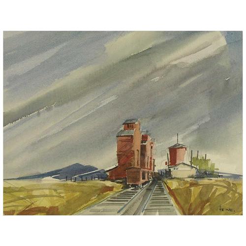 Canadian [1928-2004] GRAIN ELEVATORS, LOADING A TRAIN watercolour on paper 13 x 16.5 in. (33 x 41.9 cm) signed