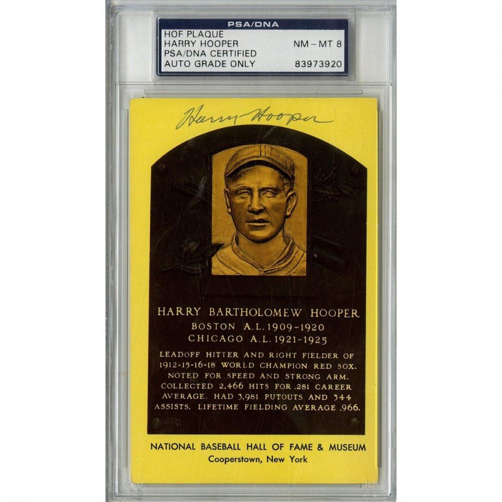 Gold Hall of Fame postcard has been hand-signed in blue ink pen by Harry Hooper (D. 1974, Red Sox HOF). Autograph has been graded (PSA 8).
