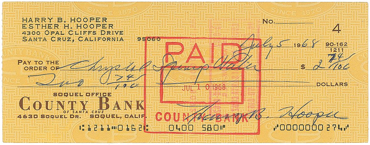 Personal check, 7 x 2.75, filled out and signed by Hooper, “Harry B. Hooper,” payable to Chrystal Springs Water for $2.74, July 5, 1968. In fine condition, with expected bank stamps (affecting the first name in the signature).