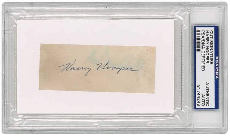 Ballpoint signature, “Harry Hooper,” on an off-white 3.5 x 1.75 slip affixed to a white 5 x 3 card. Encapsulated in a plastic PSA/DNA authentication holder. In fine condition, with some scattered light toning and soiling. RRAuction COA.