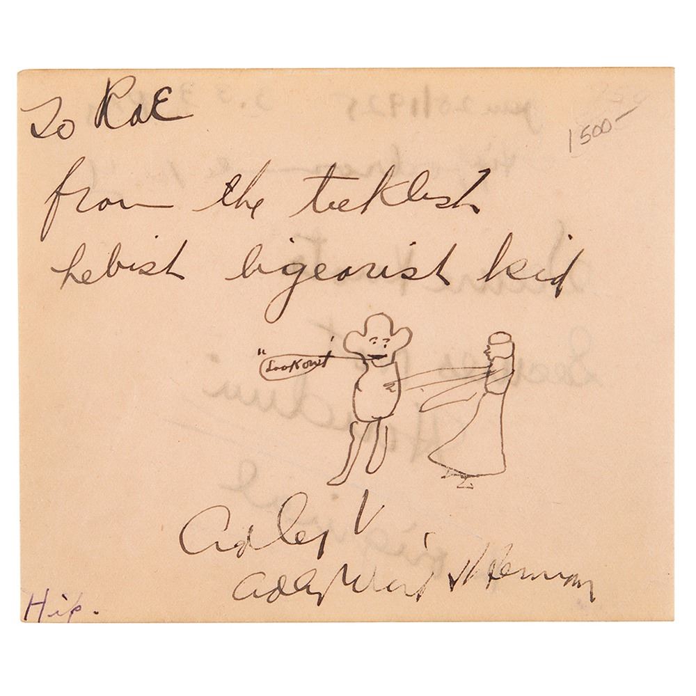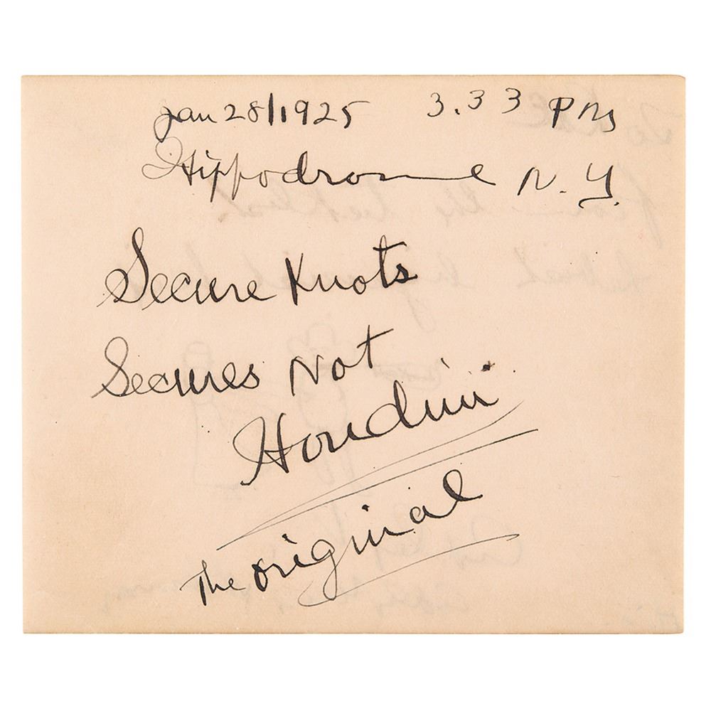 Interesting and bold AQS on a beige 5 x 4.25 album page, in full: "Jan 28/1925, 3.33 PM, Hippodrome, N.Y., Secure Knots, Secures Not Houdini, The Original." In fine condition, with light show-through from an unidentified signature on the reverse. Famed for his skill as an escape artist, this is a fantastic example of Houdini's autograph. That he signed it at the Hippodrome is also significant, as this was the venue where he debuted his 'vanishing elephant' trick in 1918.