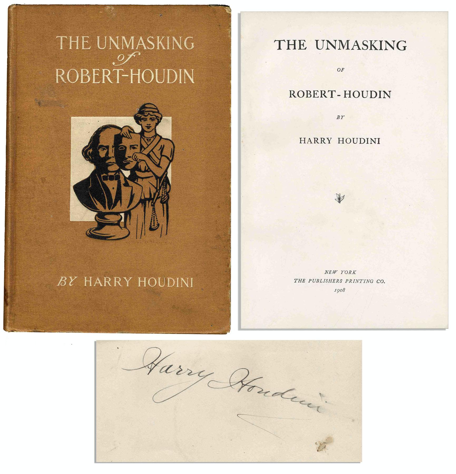 Harry Houdini signed copy of ''The Unmasking of Robert-Houdin.'' New York: Publishers Printing Co.: 1908. Uninscribed signature to front free endpaper reads simply, ''Harry Houdini'' in black fountain pen. Hardcover volume measures 5.75'' x 8.25'' and runs 333pp. Here, Houdini reveals his former mentor and namesake's illusory tricks. Small spot to signature page and part of signature lightly smudged. Book is in very good condition with light soiling to boards and shelf wear. Overall an attractive copy of this book rarely found signed.