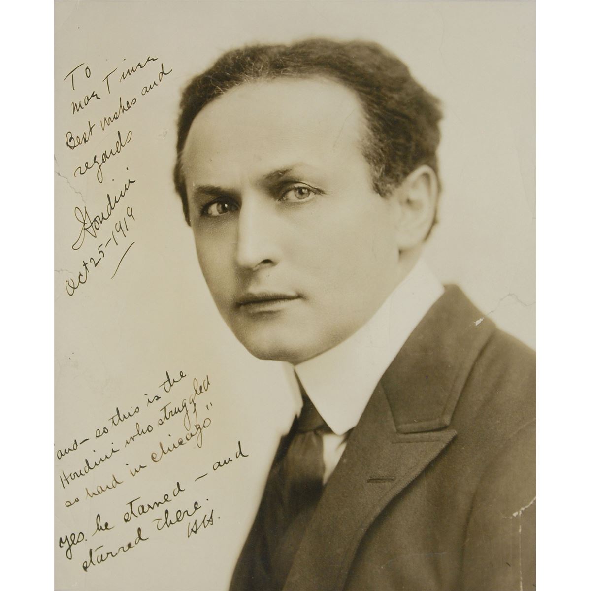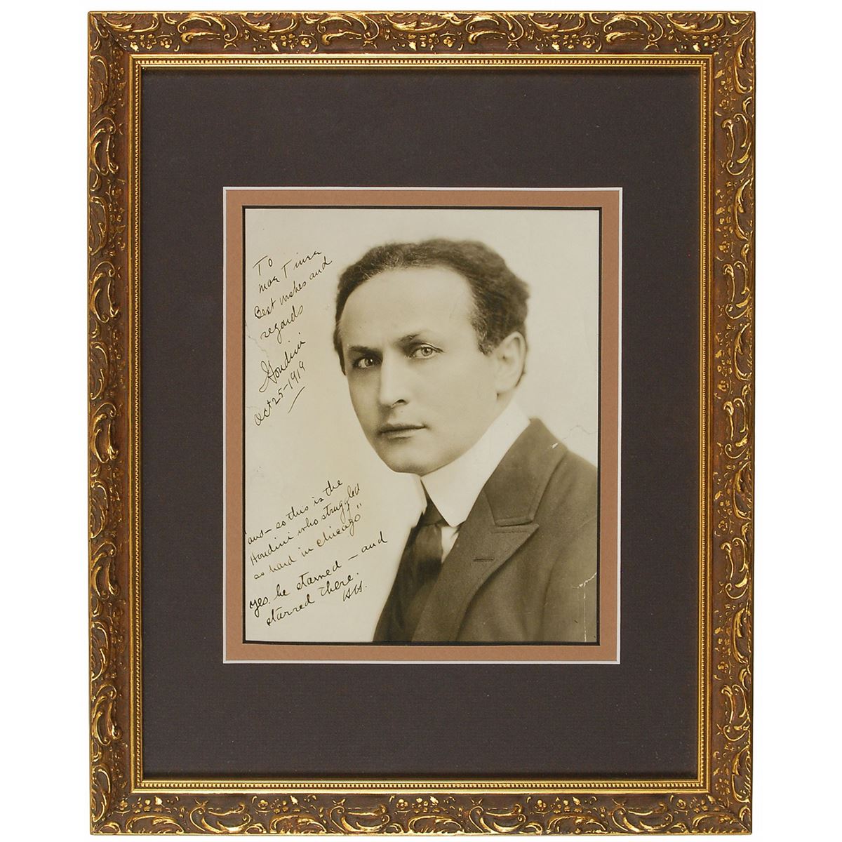 Incredible glossy 6.75 x 8.25 profile photo of Houdini, signed and inscribed in fountain pen, “To Mae Tiner, Best wishes and regards, Houdini, Oct 25—1919” and “’and—so this is the Houdini who struggled so hard in Chicago,’ Yes, he starned [sic]—and starred there. HH.” Double-matted and framed to an overall size of 12.75 x 15.75. In very good condition, with scattered creasing (resulting in many cracks to the surface), several edge tears (one approaching signature), and a small hole to the left of his forehead (none of which are affecting the extremely bold inscription and signature). Leaving behind his Manhattan home and his first steady job at a necktie factory, a teenage Eric Weiss, along with younger brother Theodore, took his magic show on tour in the late 1800s to perform in dime museums and on platforms alongside snake charmers, fire eaters, and other human oddities. In 1893 the ‘Brothers Houdini’ would head as far as west as Chicago, earning promising reviews for their performances at the World's Fair: Columbian Exposition. This unique example—bearing the magician’s signature, initials, and a third-person reference—recalls an immensely formative period of Houdini’s life, and is made all the more desirable by its bold signature, historical content, and modest voice. The James Collings Collection.