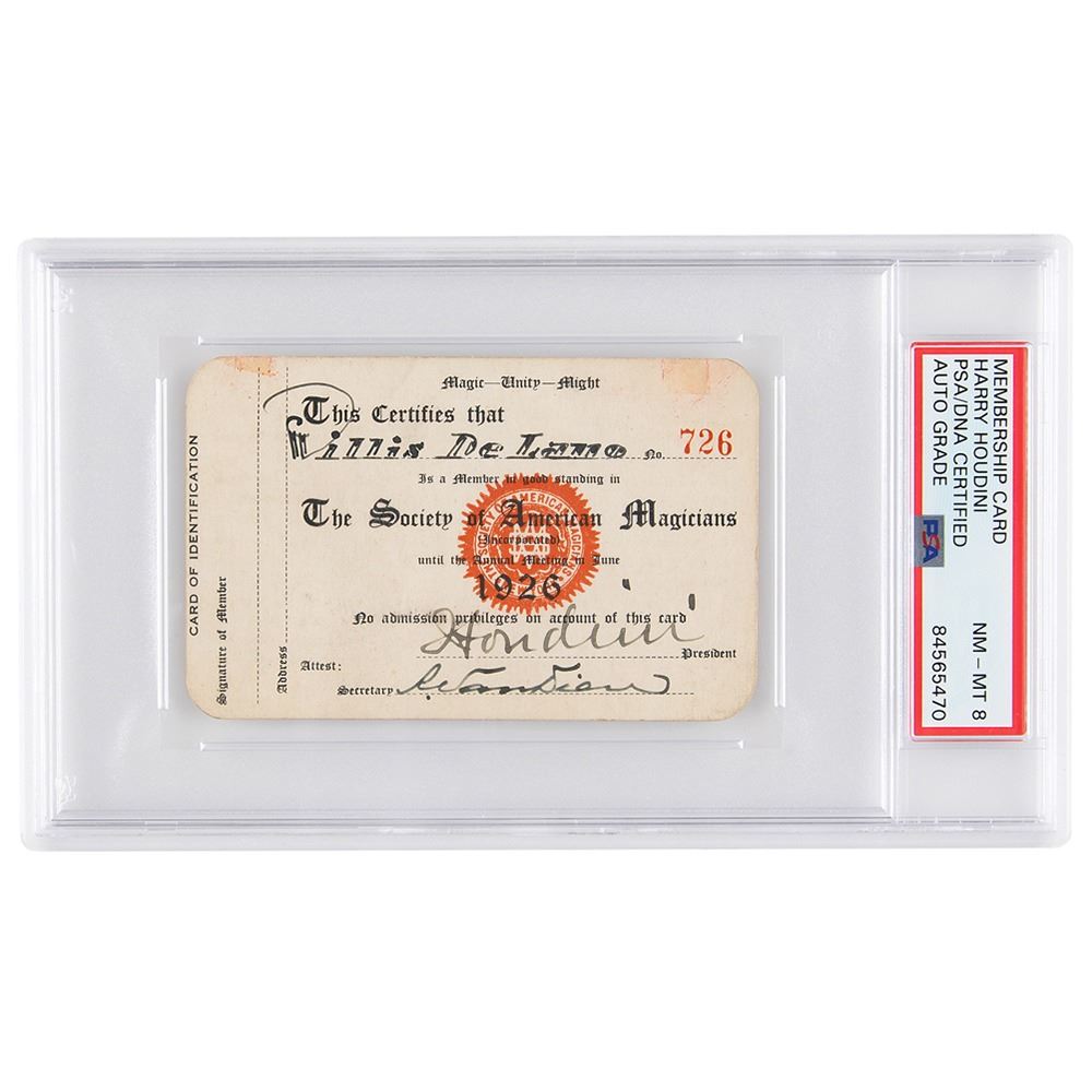 Sought-after Society of American Magicians membership card issued to Willis DeLane for 1926, 4 x 2.5, boldly signed at the bottom in fountain pen by Harry Houdini as president, and countersigned by Richard Van Dien as secretary. In fine condition, with two old tape stains to the top edge. Encapsulated and graded by PSA/DNA as "NM-MT 8."