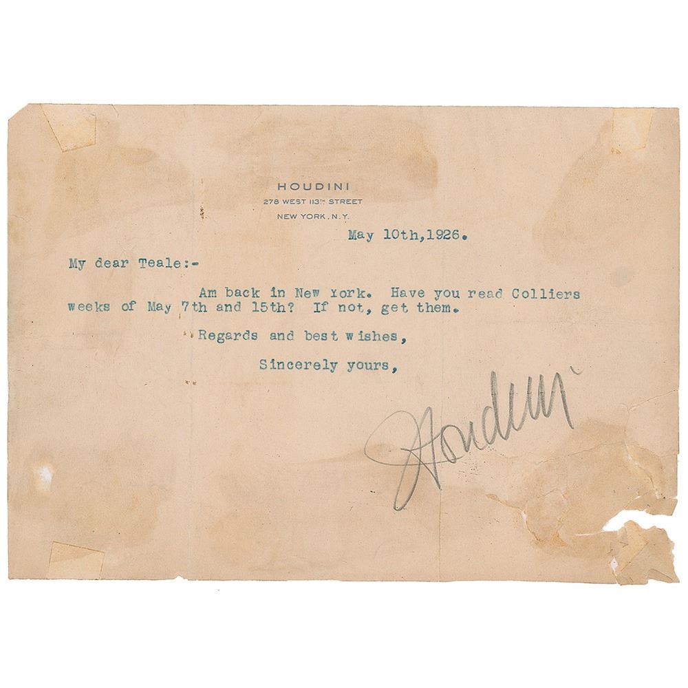 TLS signed in pencil, "Houdini," one page, 7.5 x 5.5, personal letterhead, May 10, 1926. Brief letter to his friend Oscar Teale. In full: "Am back in New York. Have you read Colliers weeks of May 7th and 15th? If not, get them." In very good condition, with trimmed edges, staining from old adhesive residue on the reverse, and two areas of paper loss, partially repaired via silking on the back. Accompanied by a full letter of authenticity from PSA/DNA.