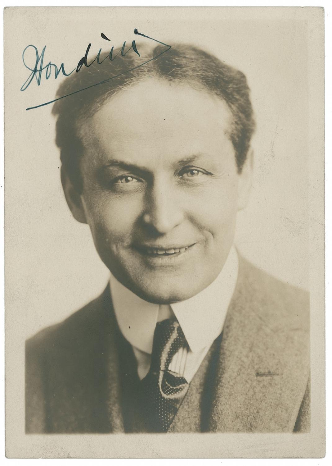 Vintage matte-finish 5 x 7 head-and-shoulders photo of Houdini smiling devilishly, signed in fountain pen, “Houdini.” Reverse of photo is stamped “Harry Houdini Collection, Houdini Original.” In fine condition, with some scattered light soiling, not affecting signature or overall image. Original photographer studio prints of this photo, a personal favorite which he used extensively in his programs and publicity materials after 1910, are scarce, especially an autographed example signed as nicely as this one.