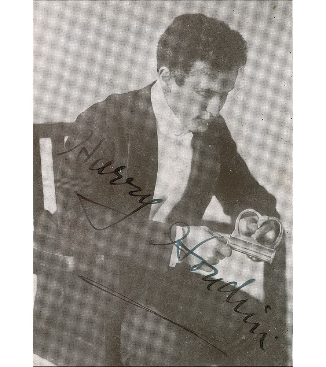 Vintage postcard photo of Houdini fiddling with a set of handcuffs, trimmed to a size of 3 x 4.25, nicely signed in fountain pen. In fine condition.