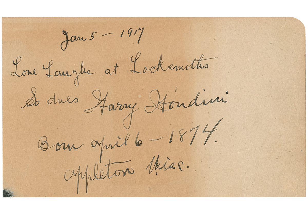 AQS on an off-white 6.5 x 4 album page, in full: “Jan. 5—1917, Love Laughs at Locksmiths, So does Harry Houdini, Born April 6—1874, Appleton, Wisc.” After years of doubt as to the true circumstances of Houdini’s birth, extensive research confirmed in 1972 that he was born Erich Weiss in Budapest, Hungary on March 24, 1874. From 1907 on, however, Houdini claimed American birth, and on a different date, evidently in an attempt to conceal his humble European origins. In very good condition, with toning to left two-thirds of sheet (touching most of the text and affecting appearance), mild soiling, mounting remnants to reverse, and small tear at lower left corner (well away from writing). The writing is dark, clear, and well-contrasted throughout. Highly desirable! with a great magic-related theme.