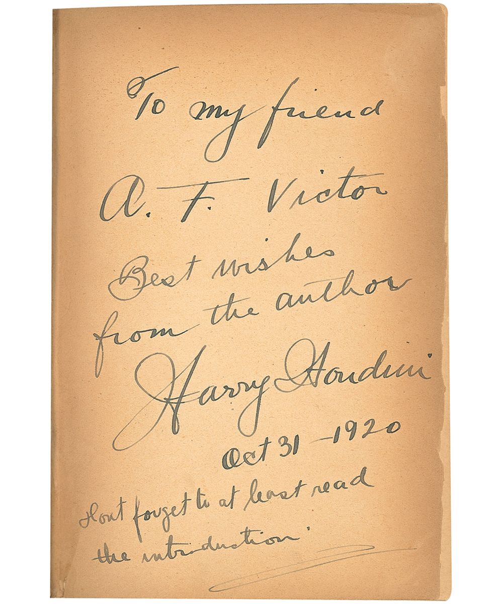 Houdini inscribed the book to Alexander F. Victor (1878-1961), the “Boy Wonder of Magic and Illusion” who began his career in legerdemain at 16. He performed as Alexander the Great in the U.S. until a fire destroyed all of his magic props in 1908. Victor went on to a successful career as an inventor, developing 300 devices including the first electric washing machine and the 16-mm sound movie projector. A remarkable inscription to a fellow magician in one of his best known books.