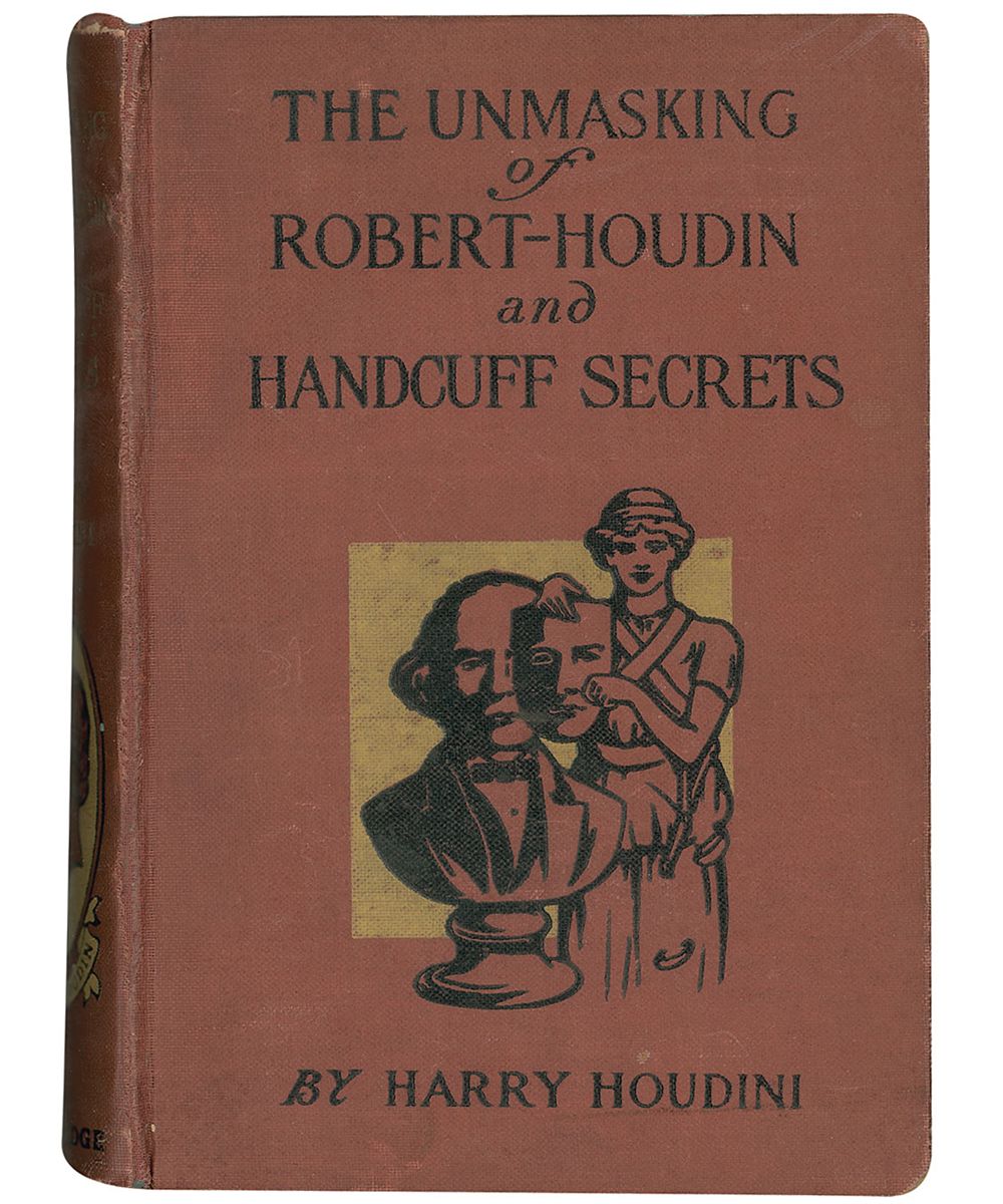 Houdini first published his copiously illustrated book in New York in 1908. The following year, he added “Handcuff Secrets,” a 110 page treatise on his famed handcuff tricks, to a combined manuscript published in England. Houdini angered many in the magic profession with the book’s publication: Jean Eugène Robert-Houdin (1805-1871) was the preeminent magician of the nineteenth century and is considered the father of the modern style of magic. As a youth, Houdini idolized Houdin, and indeed styled his stage name to reference the magician. However, as his expertise in illusion grew, Houdini became disillusioned with the former idol and wrote this scathing critique of Houdin’s routines, calling the legendary illusionist “a mere pretender, a man who waxed great on the brainwork of others.” In the book, he details the origins of most of Houdin’s famous performances and assails the renowned conjurer for his “supreme egotism” and habit of exaggerating his exploits—criticisms often made against Houdini himself.