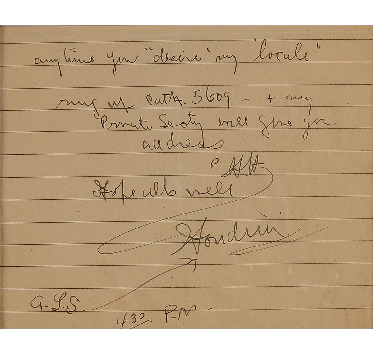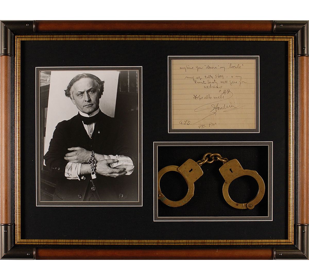 ANS signed “H.H.” and “Houdini,” one page, lightly-lined, 5.75 x 5, no date. Brief note to an unidentified recipient. In full: “Anytime you ‘desire’ my ‘locale’ ring up Cath. 5609 - & my Private Secty will give you address p HH Hope all is well. Houdini,” with Houdini adding “A.L.S. 430 P.M,” along the bottom edge. Double matted and framed, with a portrait of Houdini in shackles and a pair of handcuffs (not Houdini’s) with Chinese markings, to an overall size of 21.25 x 16.25. A central vertical fold, a bit of light soiling, and a uniform shade of toning, otherwise fine condition. Houdini lived at 278 West 113th Street in Manhattan, a ten minute walk from Columbia University. He purchased the four story brownstone building in 1904 and lived there until his death in 1926. Houdini’s telephone number, mentioned in this note, was Cathedral 5609.
